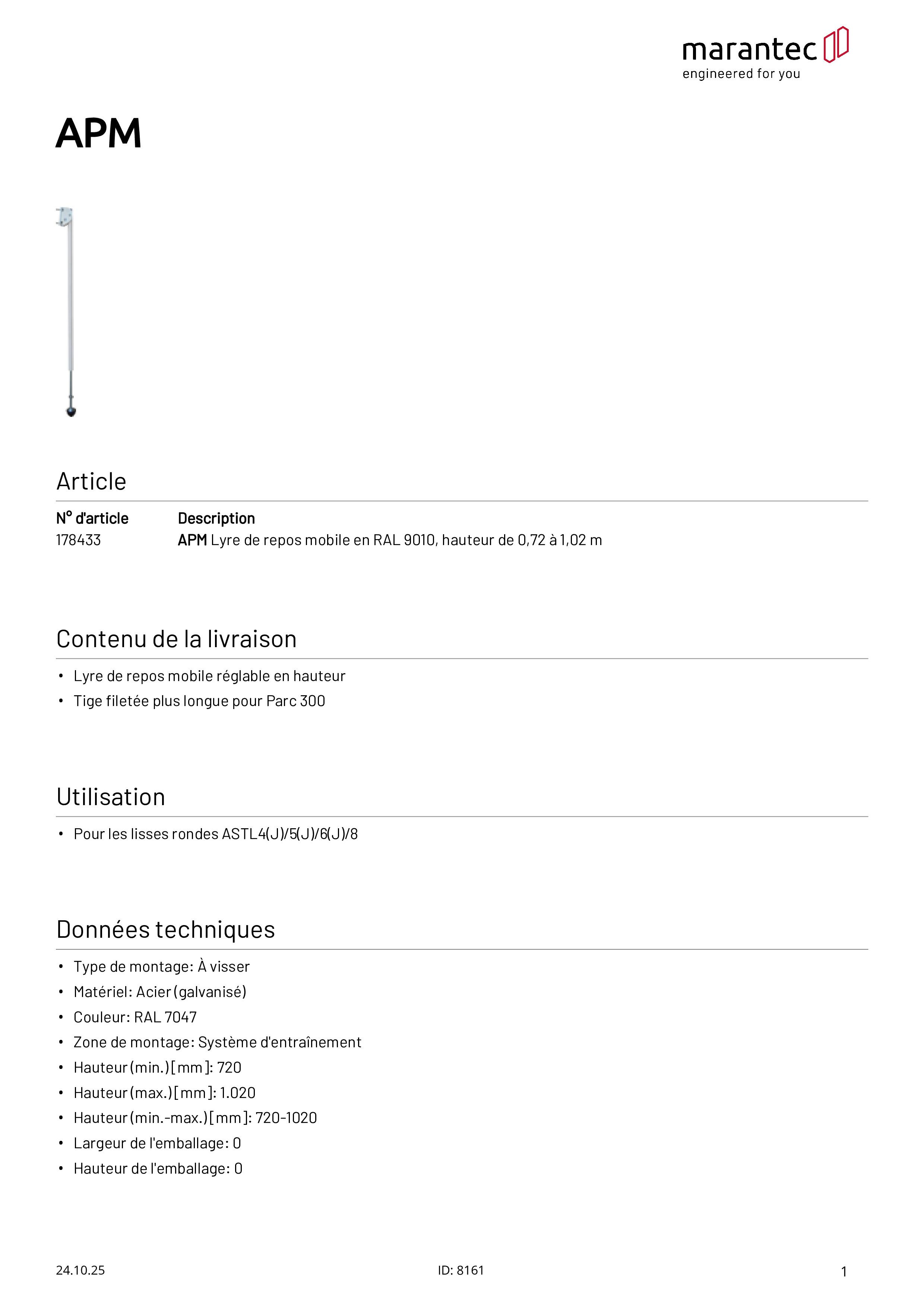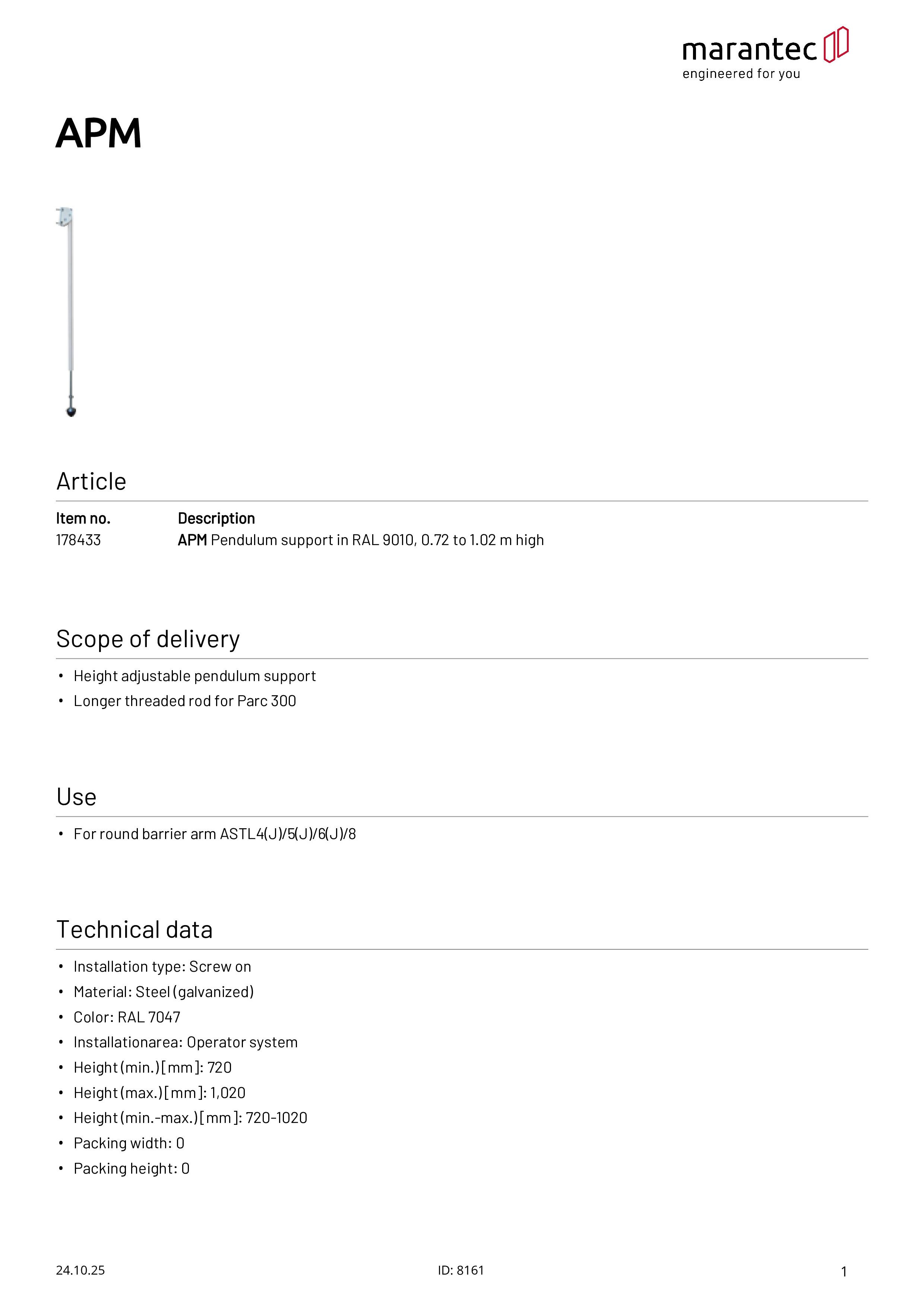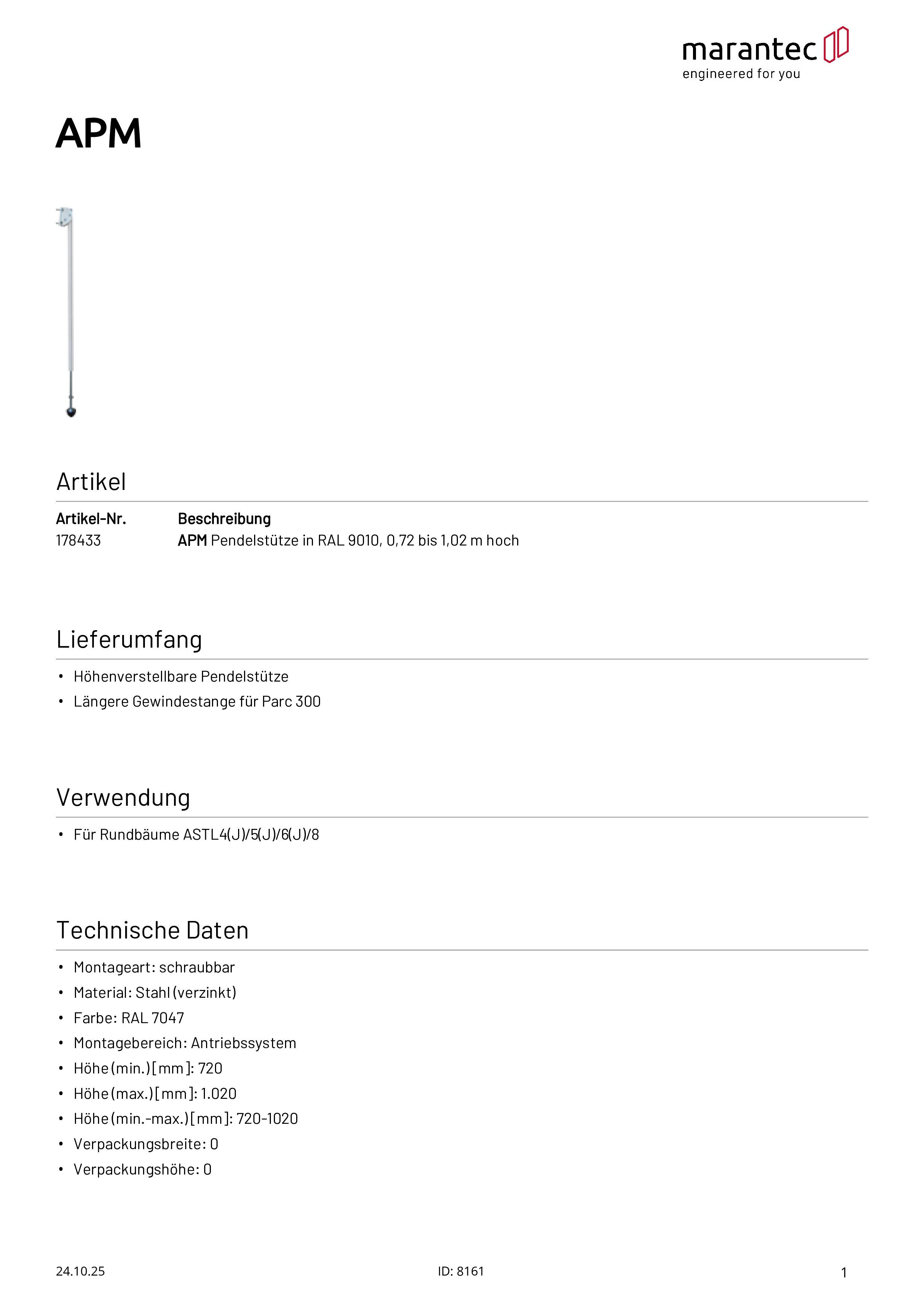 APM Pendelstütze RAL 9010, 0,72-1,02 m hoch