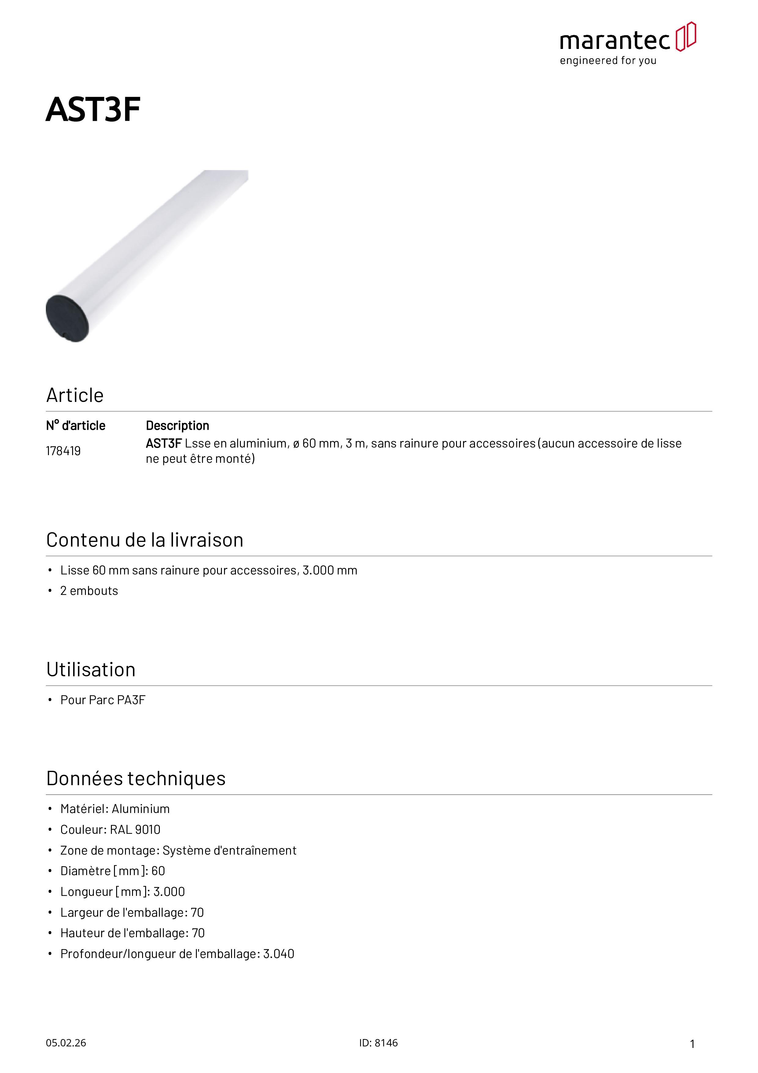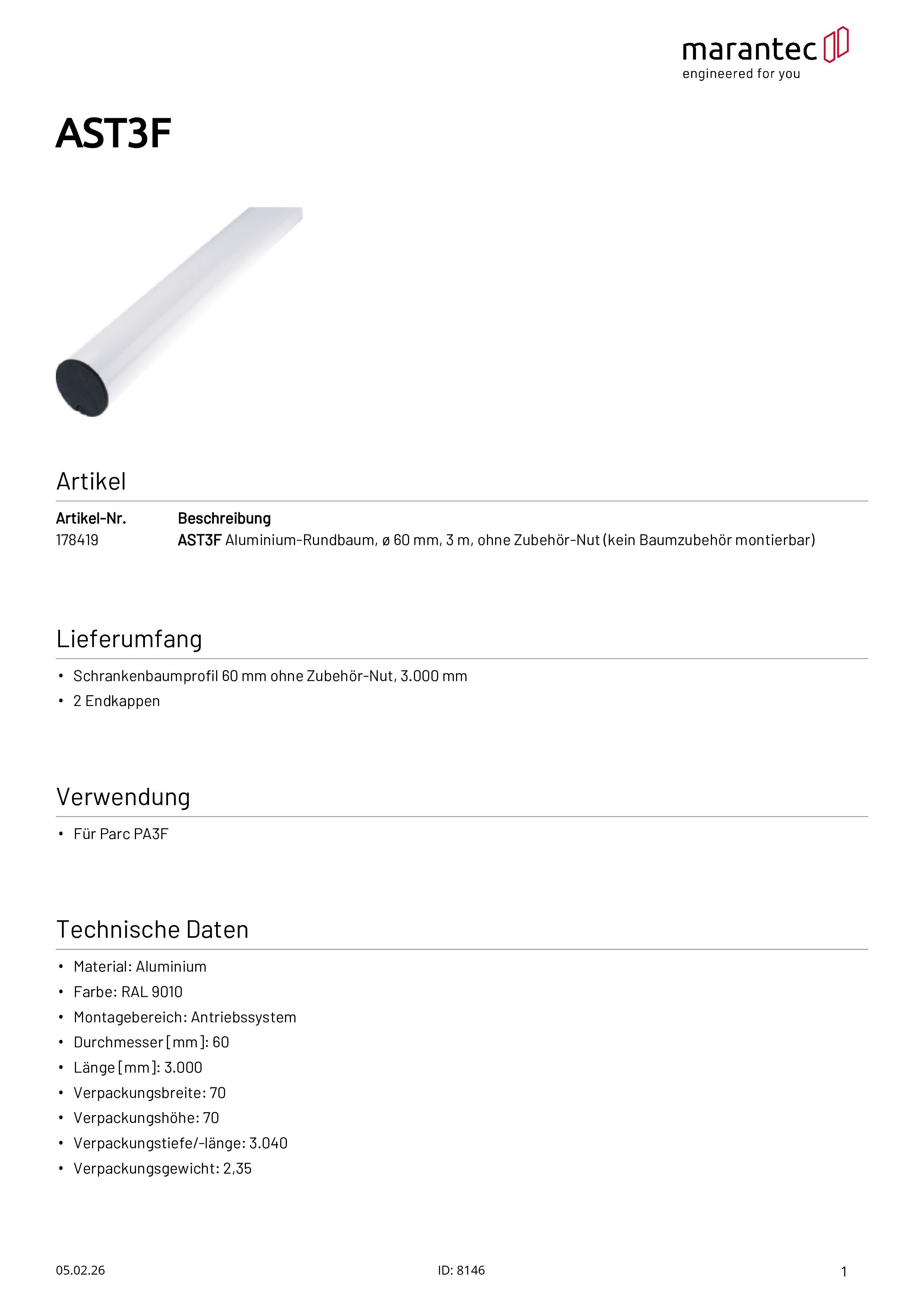 Aluminium-Rundbaum, ø 60 mm, 3 m, ohne Zubehör-Nut (kein Baumzubehör montierbar). Für Parc PA3F.