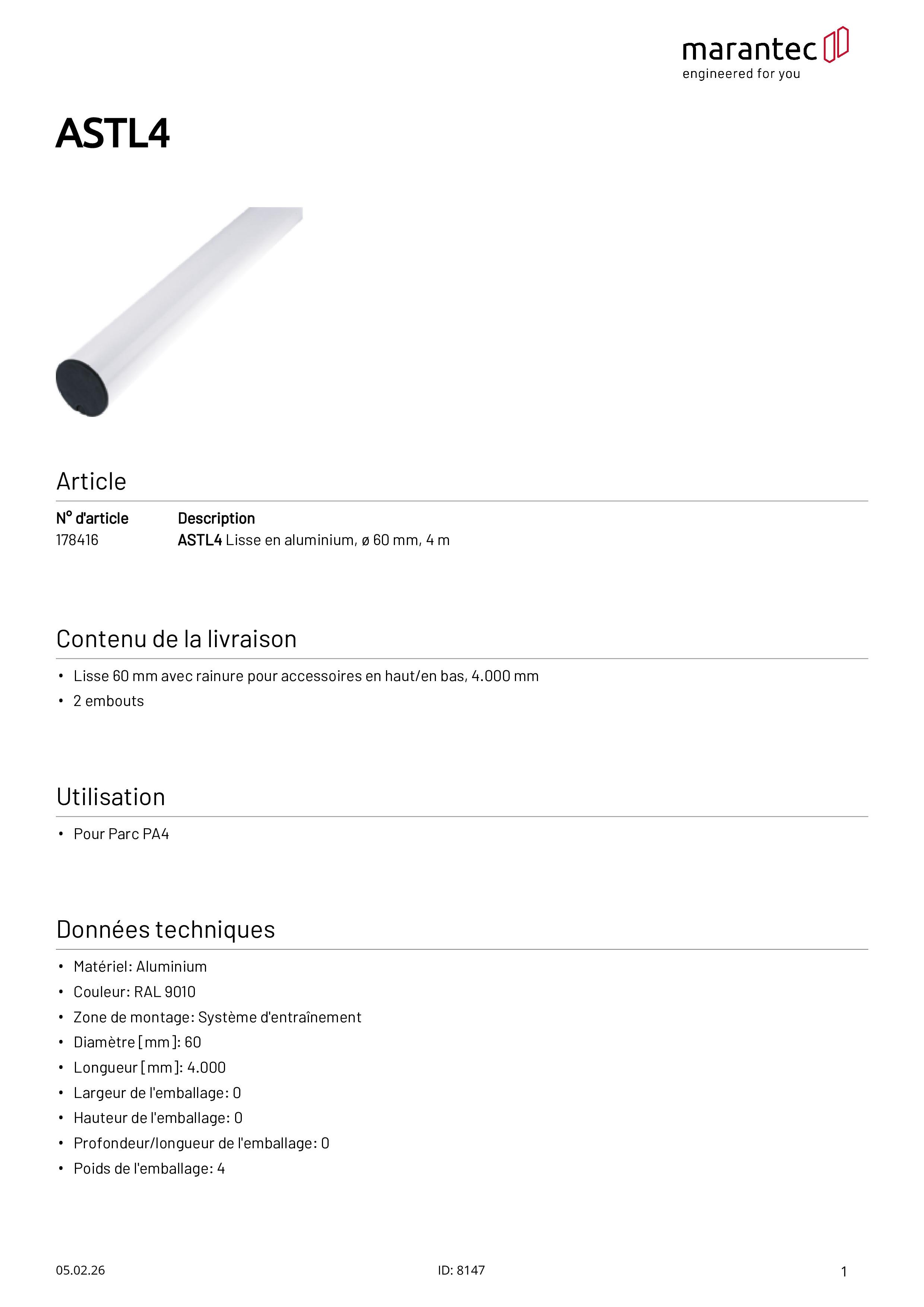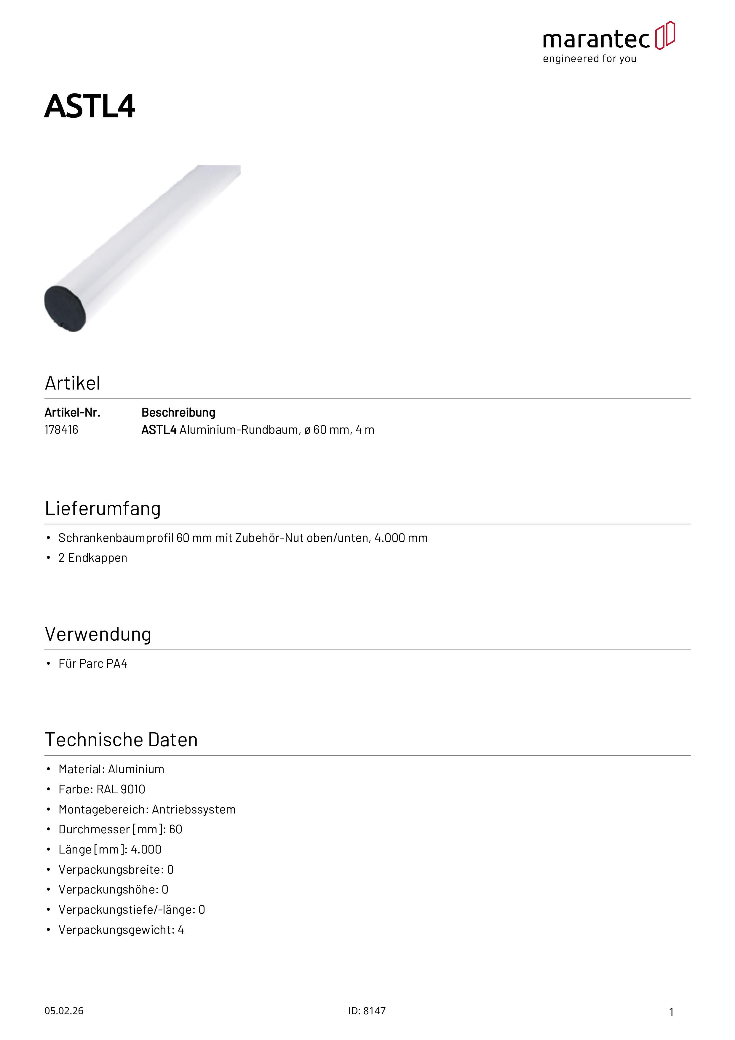 Aluminium-Rundbaum, ø 60 mm, 4 m. Für Parc PA4.