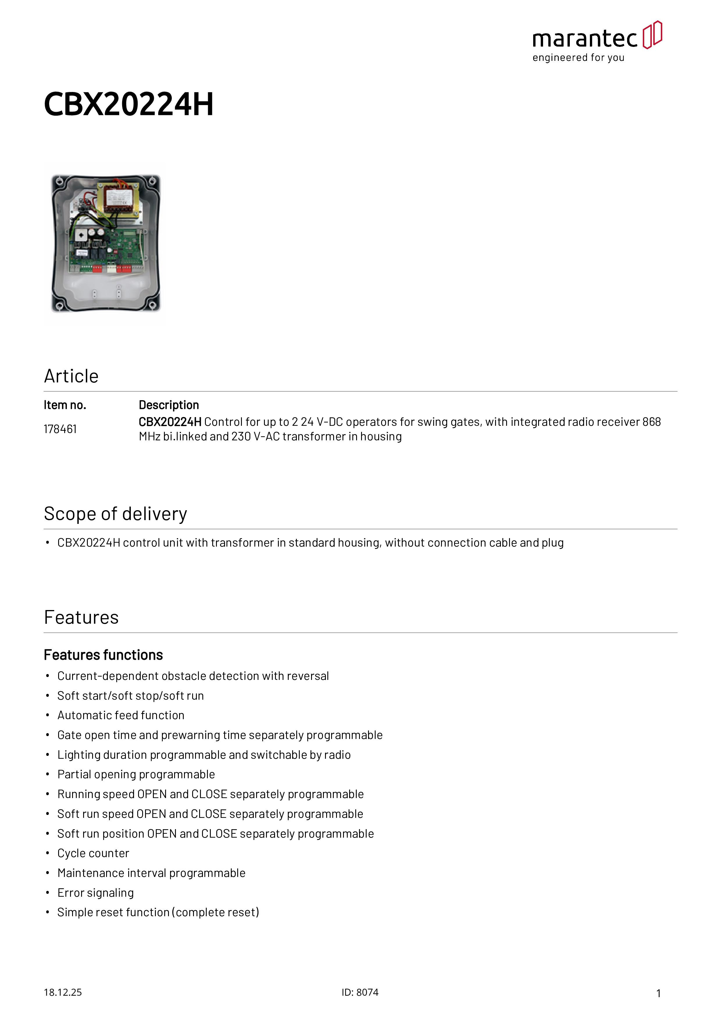 - Steuerung CBX20224H mit Transformator im Standardgehäuse, ohne Anschlusskabel und Stecker