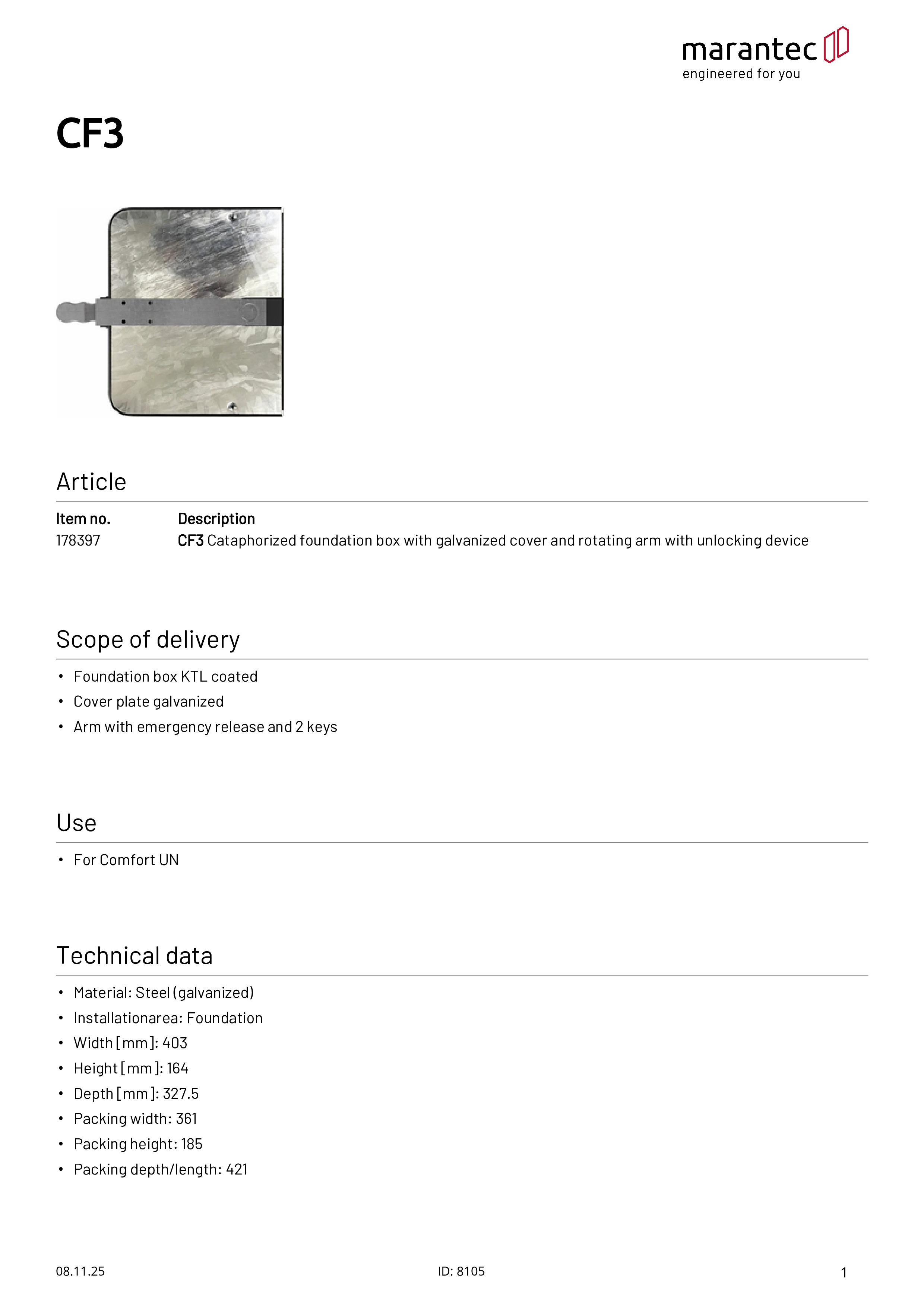 CF3 Fundamentkasten mit Dreharm und Entriegelung für Comfort UN