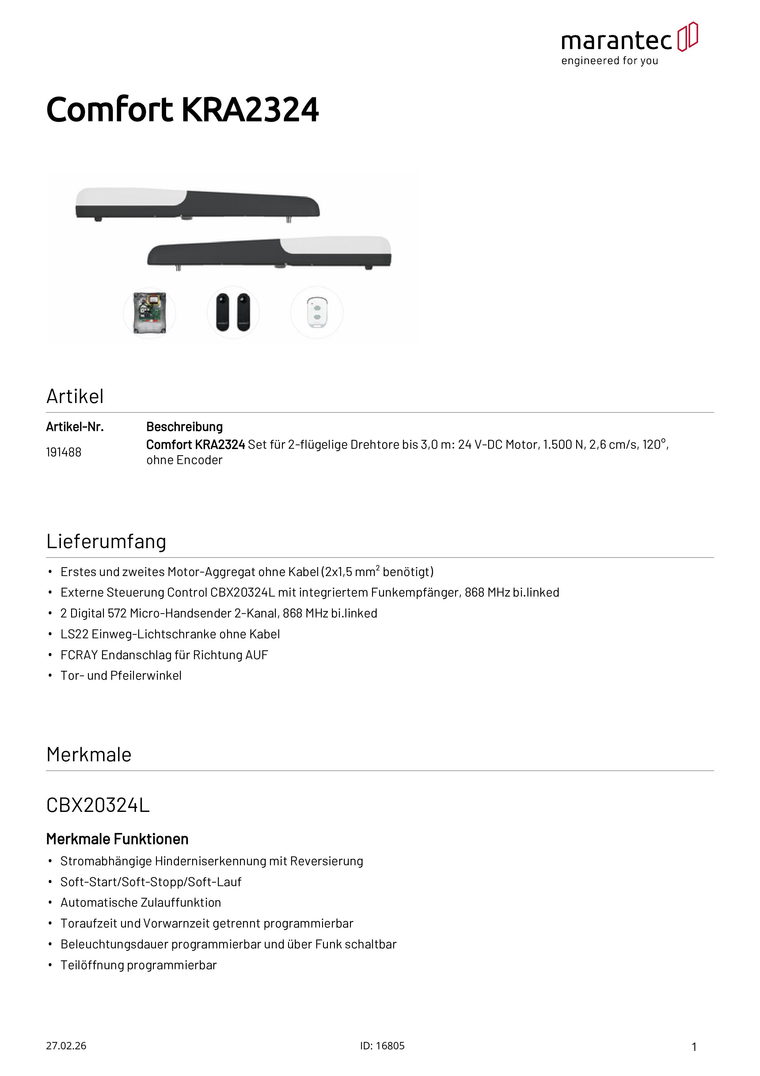 Comfort KRA2324 Set für 2-flügelige Drehtore bis 3,0 m, ohne Encoder, 868 MHz bi.linked