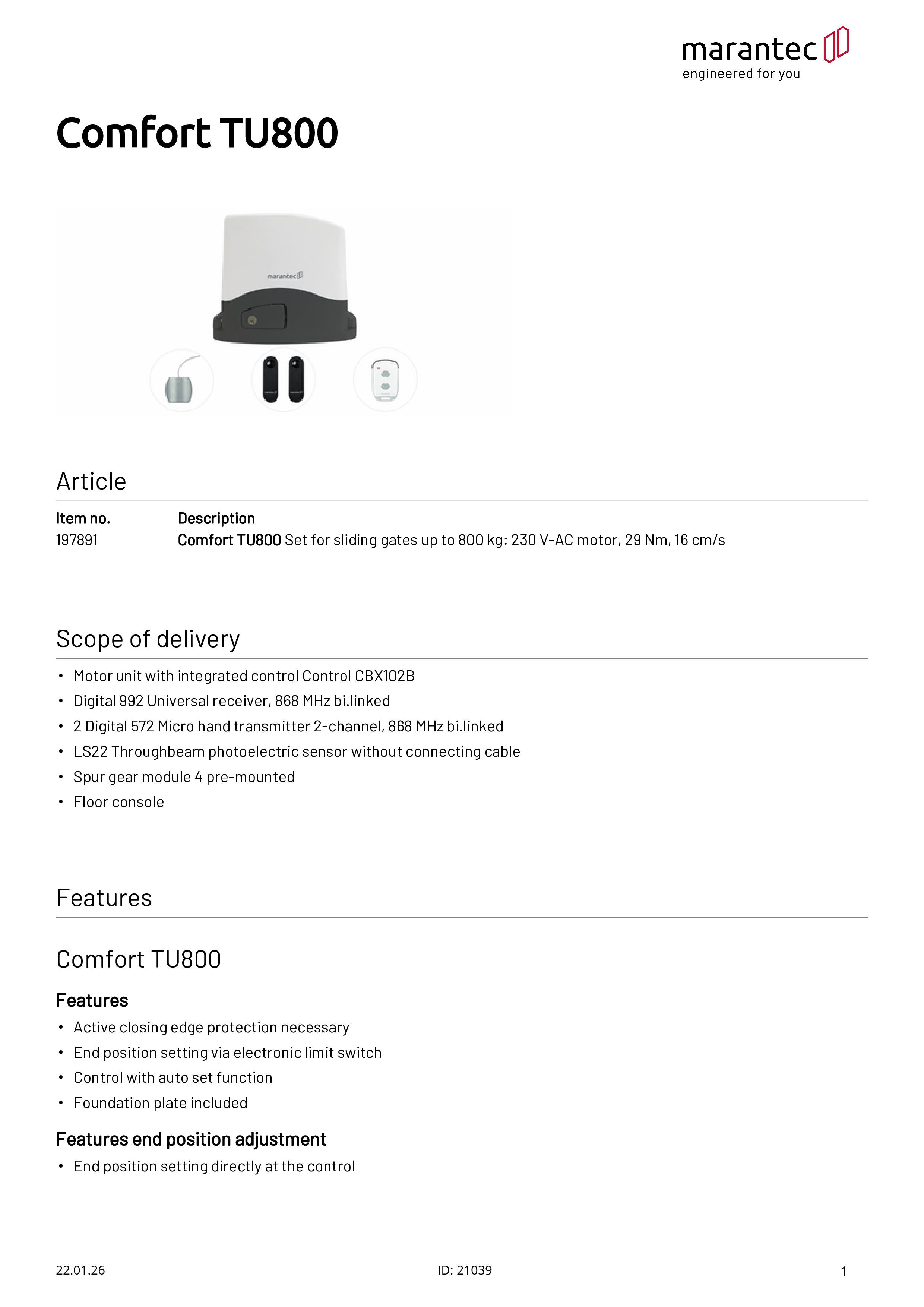 Comfort TU900 für Schiebetore bis 900 kg, 230 V-AC Motor, 16 cm/s, 868 MHz bi.linked