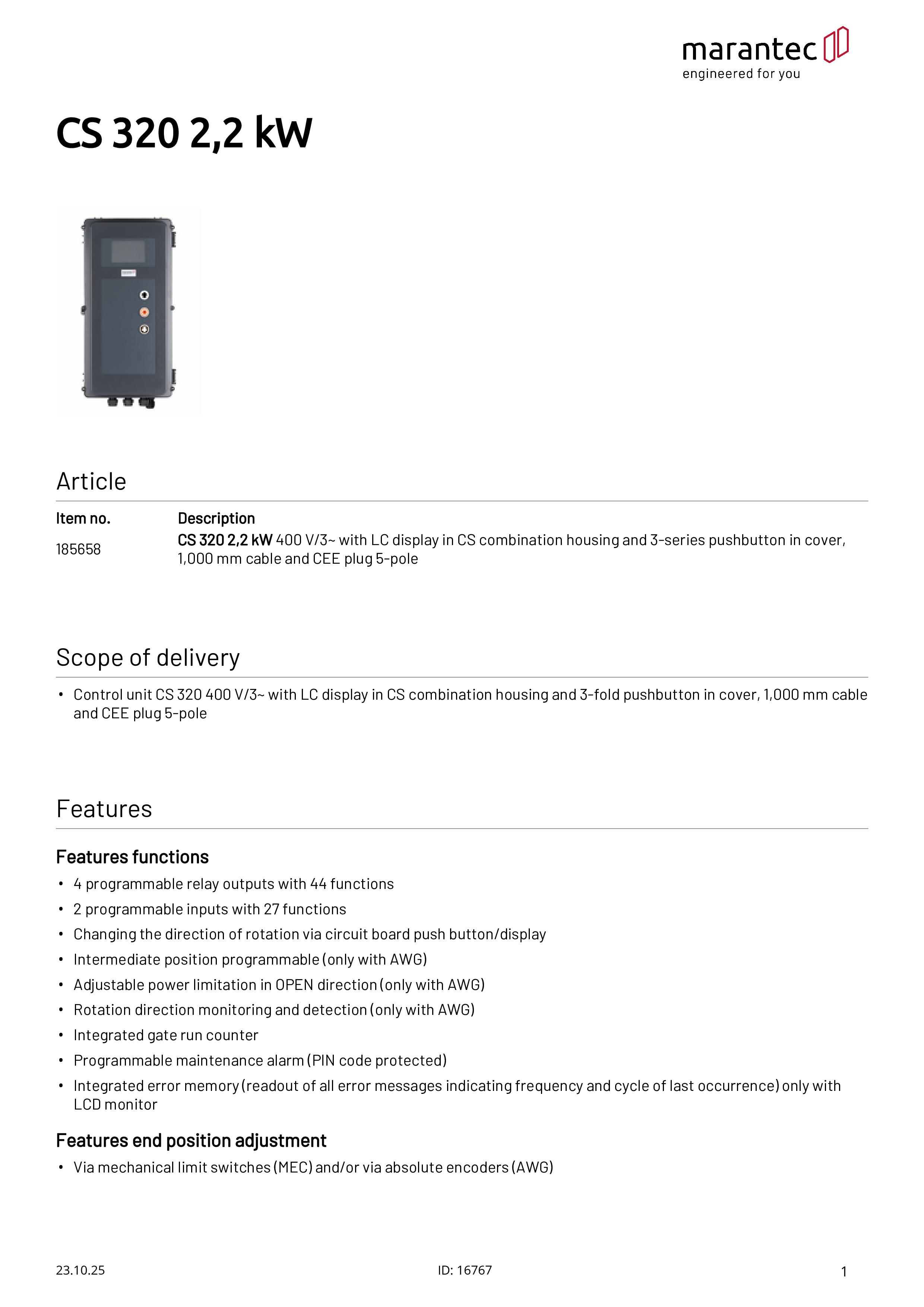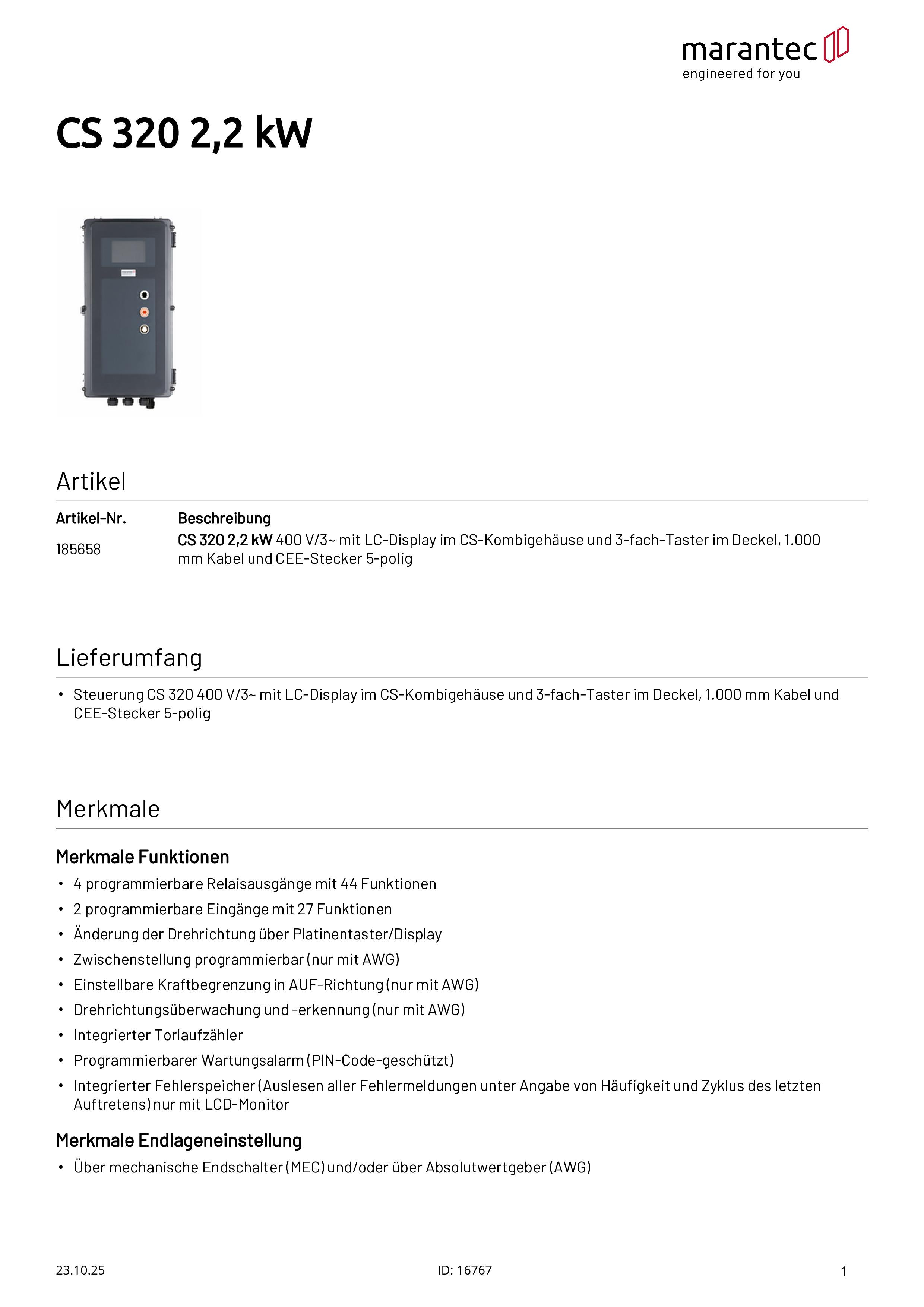 - Steuerung CS 320 400 V/3~ mit LC-Display im CS-Kombigehäuse und 3-fach-Taster im Deckel, 1.000 mm Kabel und CEE-Stecker 5-polig