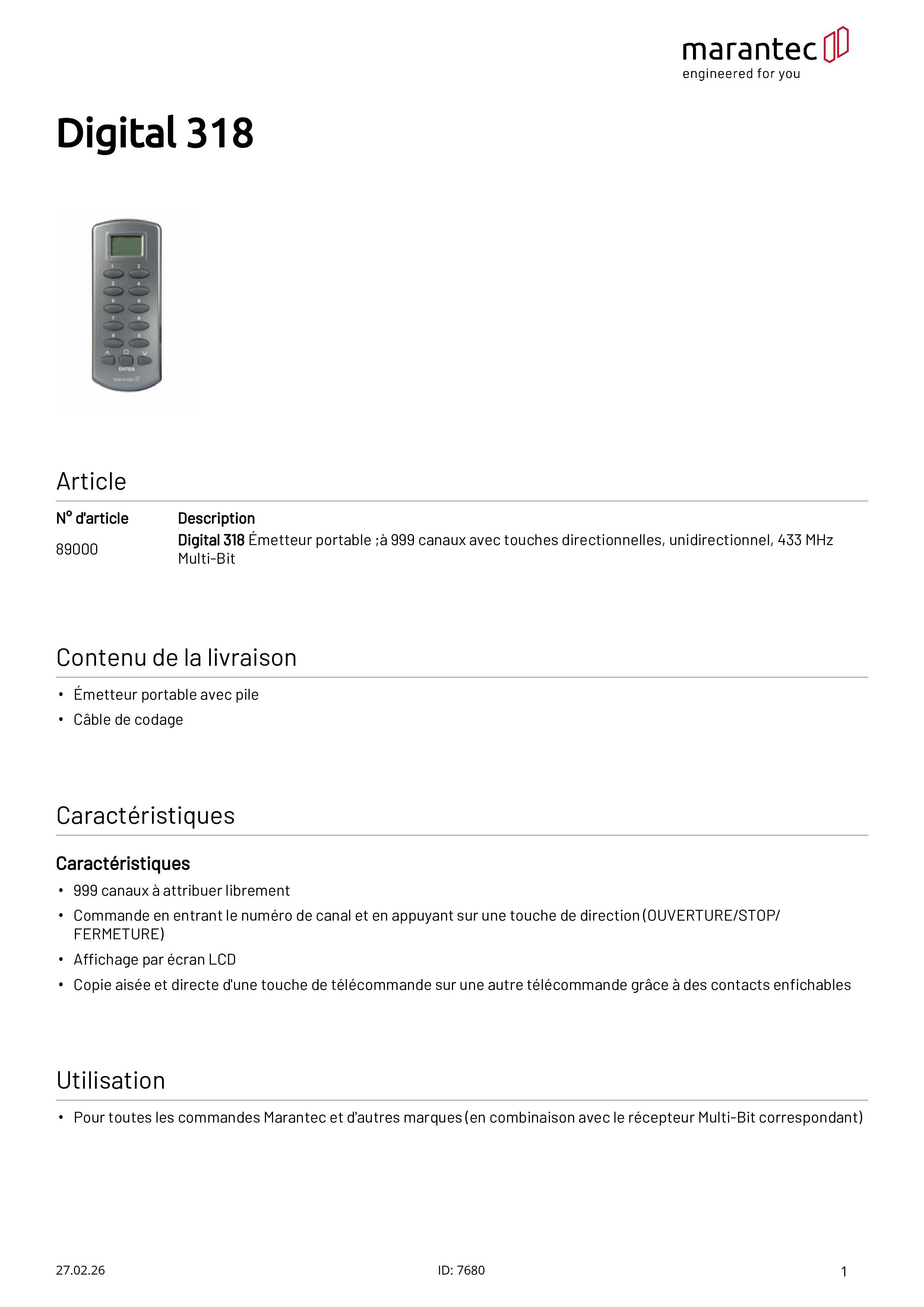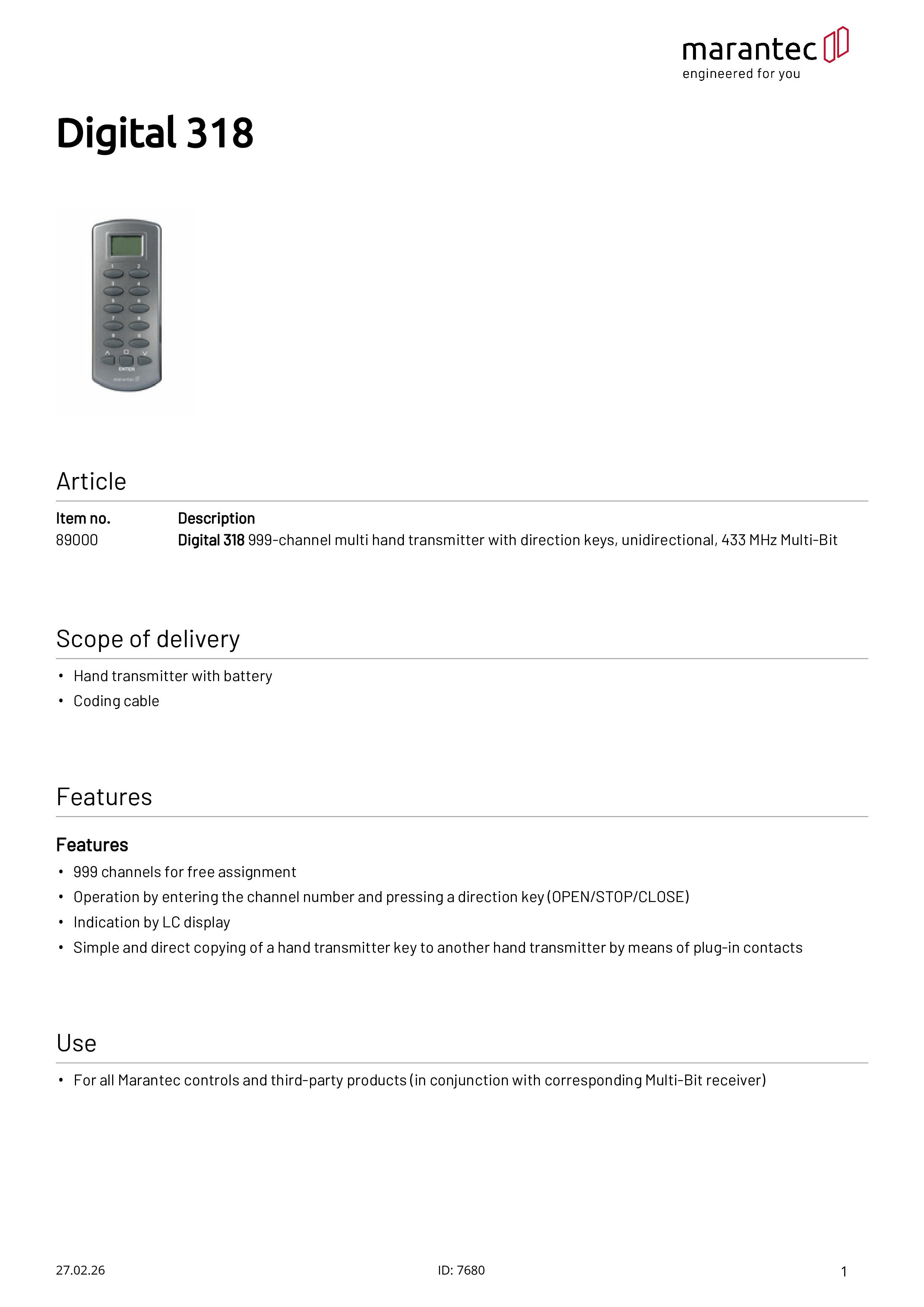 Digital 318 Handsender 999-Kanal 433 MHz Multi-Bit