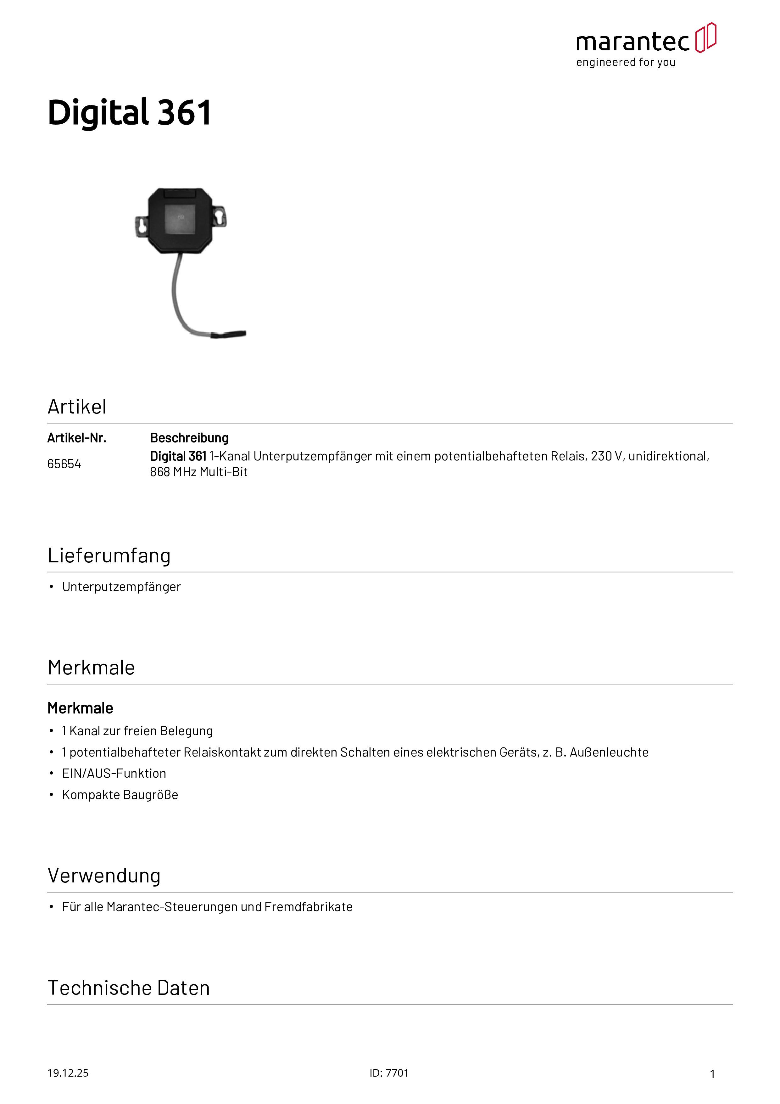 Digital 361 1-Kanal Unterputzempfänger 230 V, 868 MHz Multi-Bit