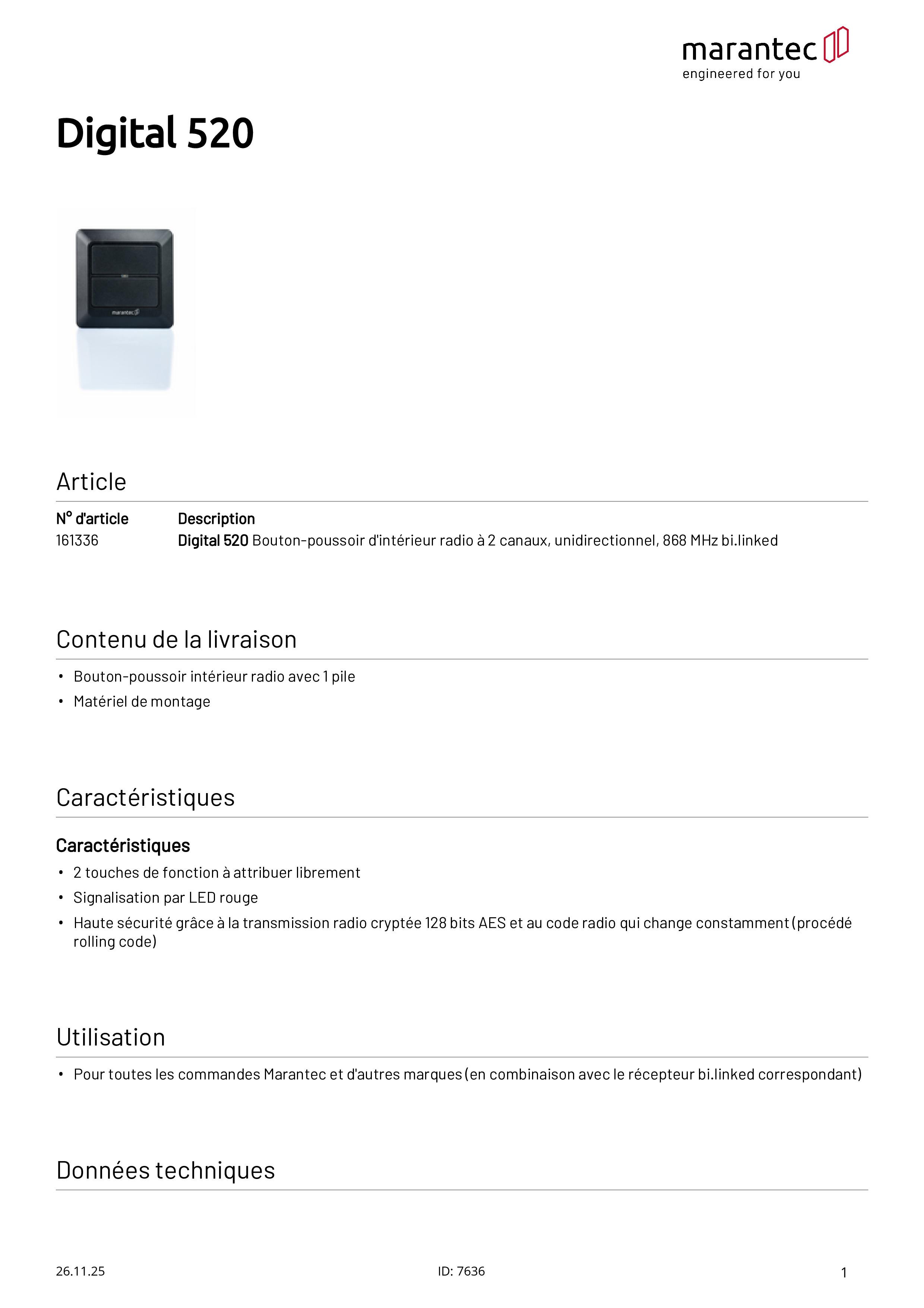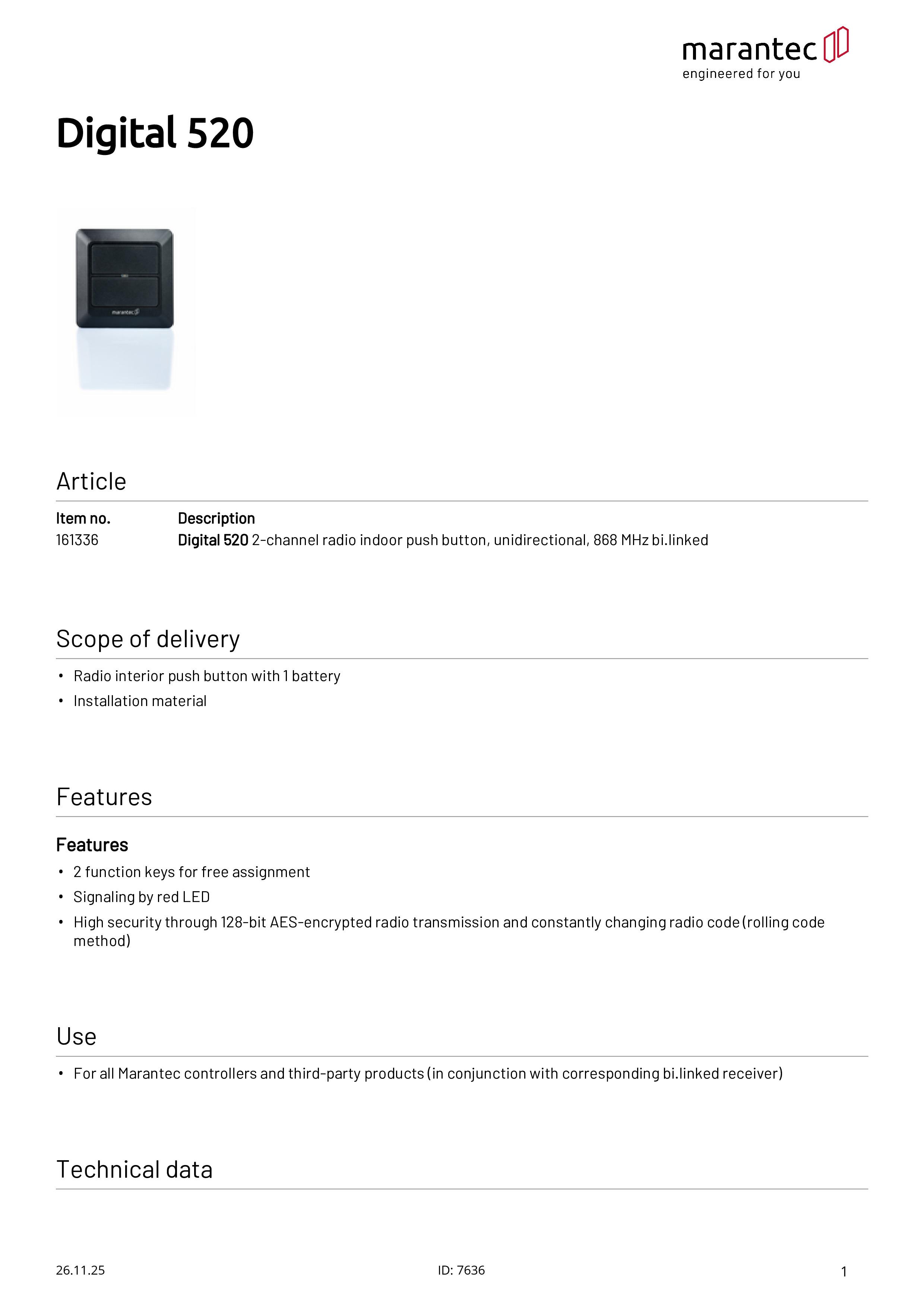 Digital 520 2-Kanal Funk-Innendrucktaster, 868 MHz bi.linked