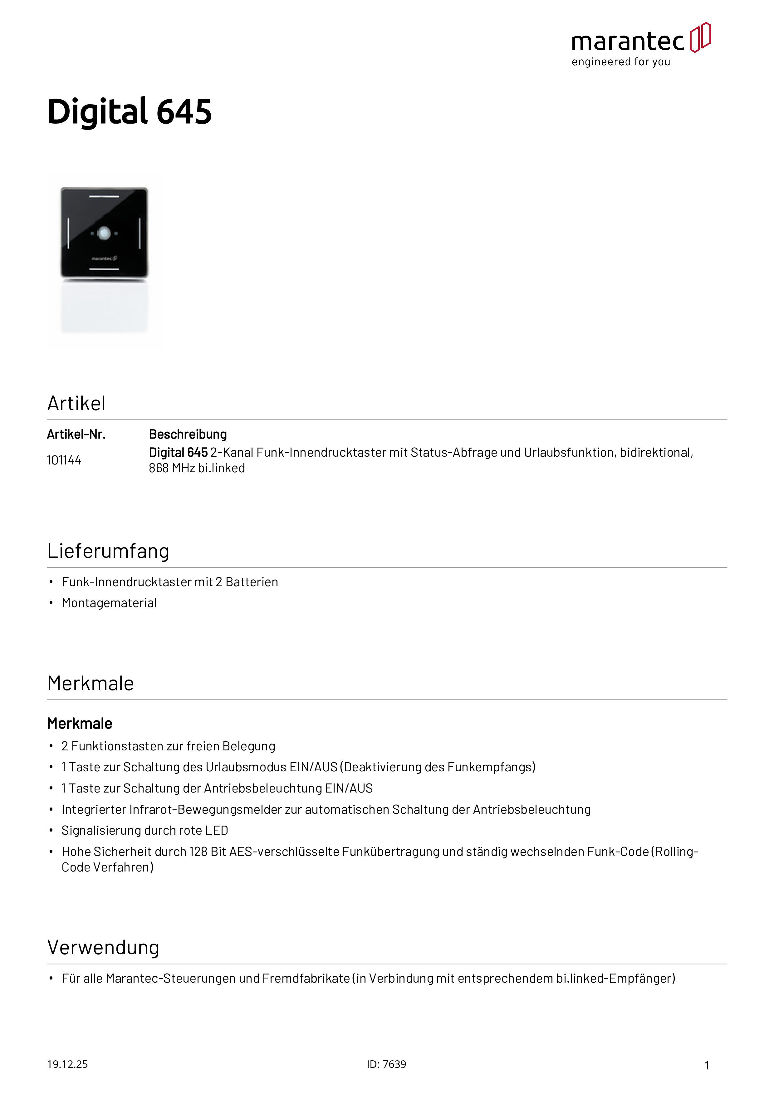 - Hohe Sicherheit durch 128 Bit AES-verschlüsselte Funkübertragung und ständig wechselnden Funk-Code (Rolling-Code Verfahren)