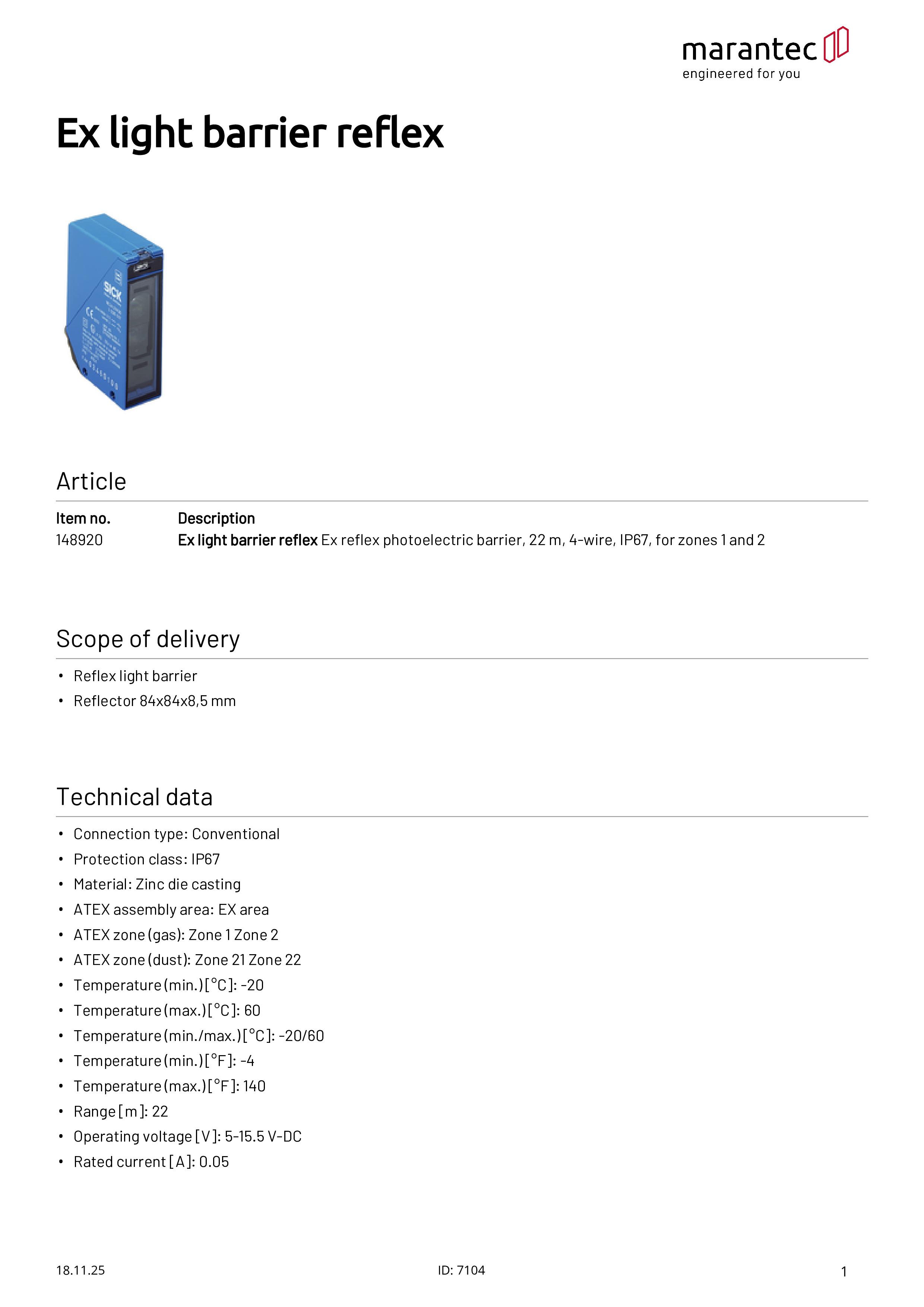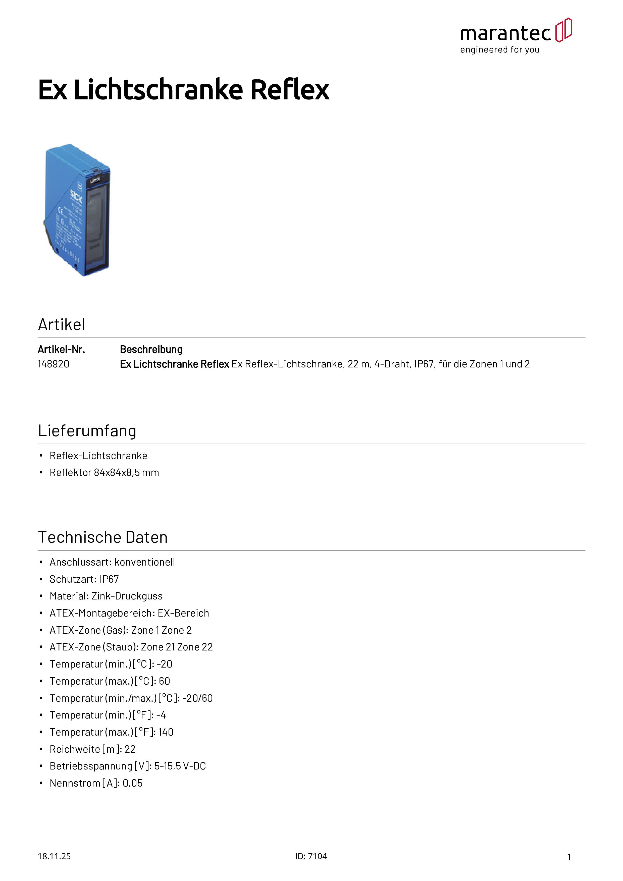 Ex Lichtschranke Reflex, 8 m, 2-Draht, IP67, für Zone 1/2