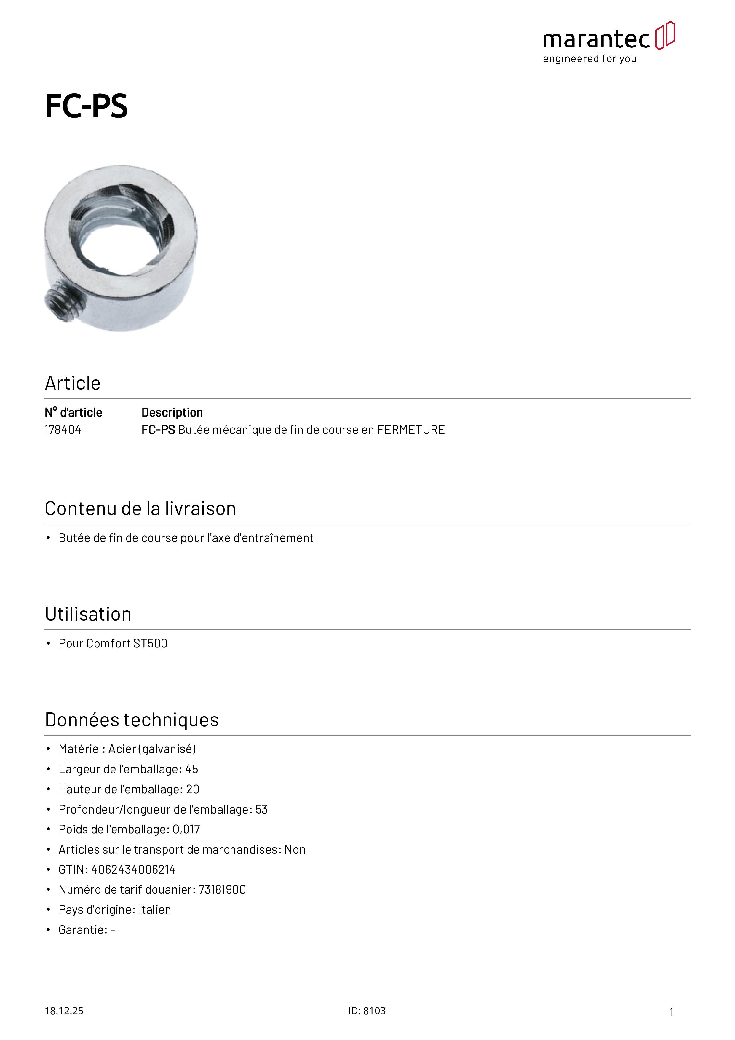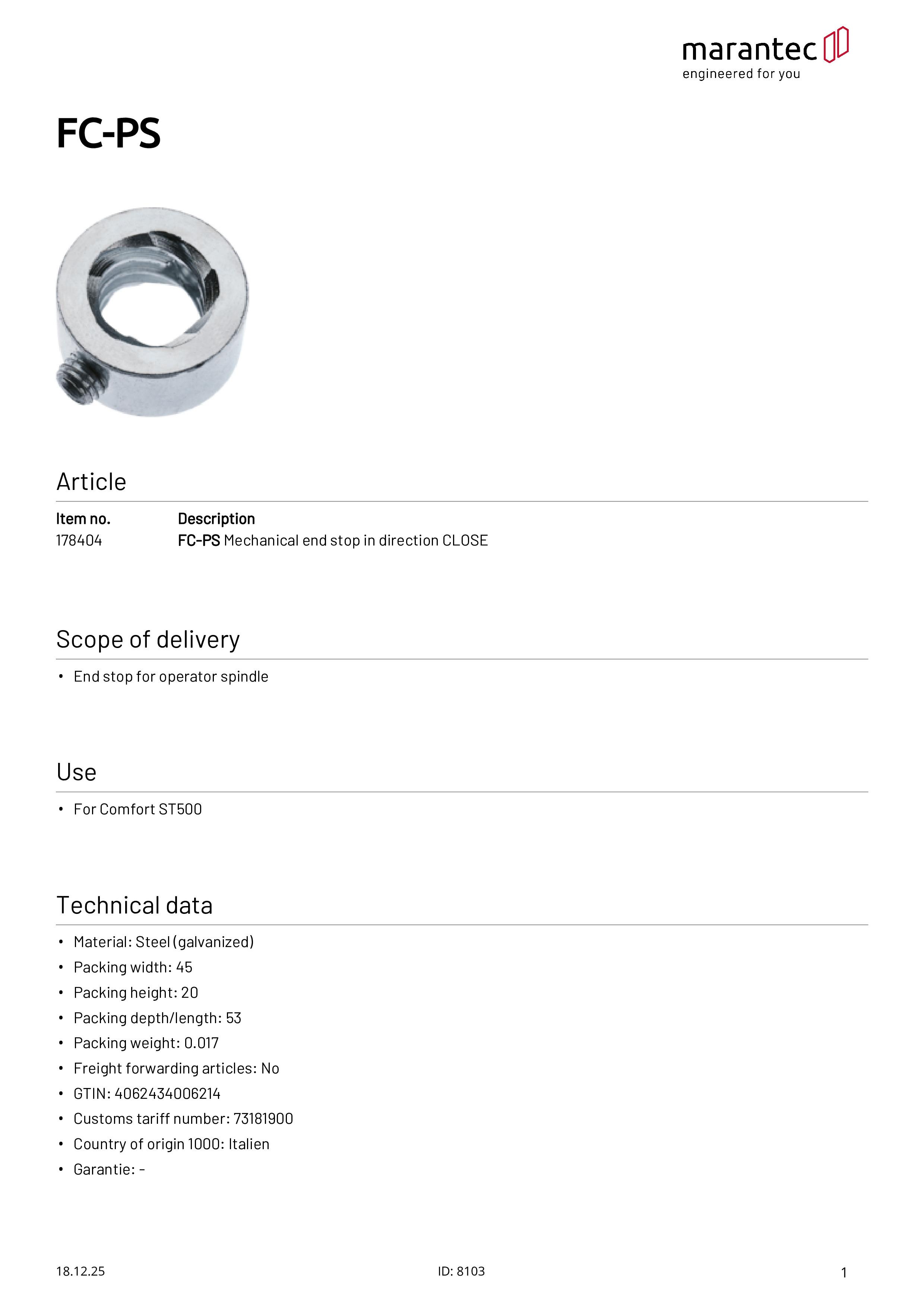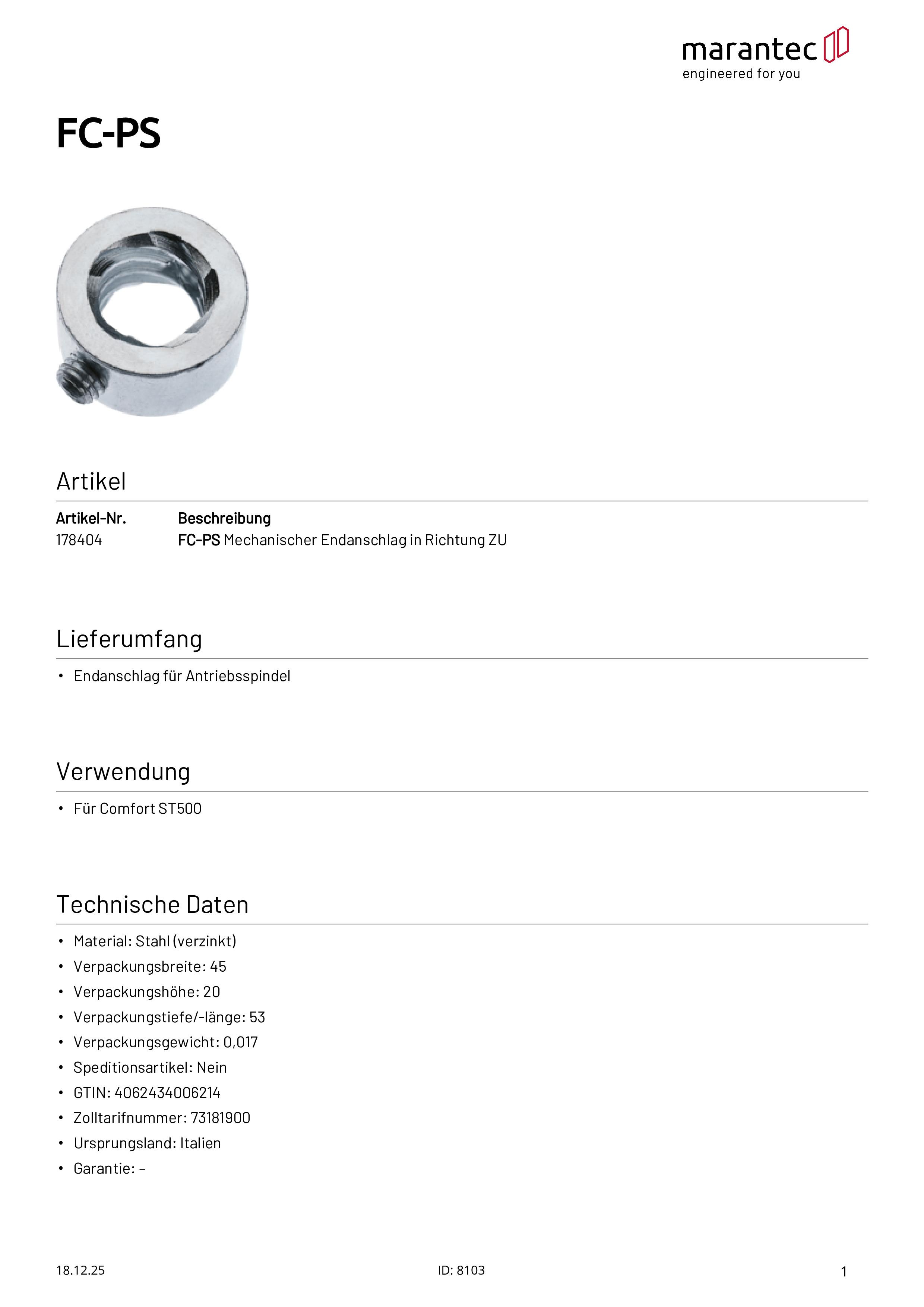 FC-PS Mechanischer Endanschlag in Richtung ZU für Comfort ST500