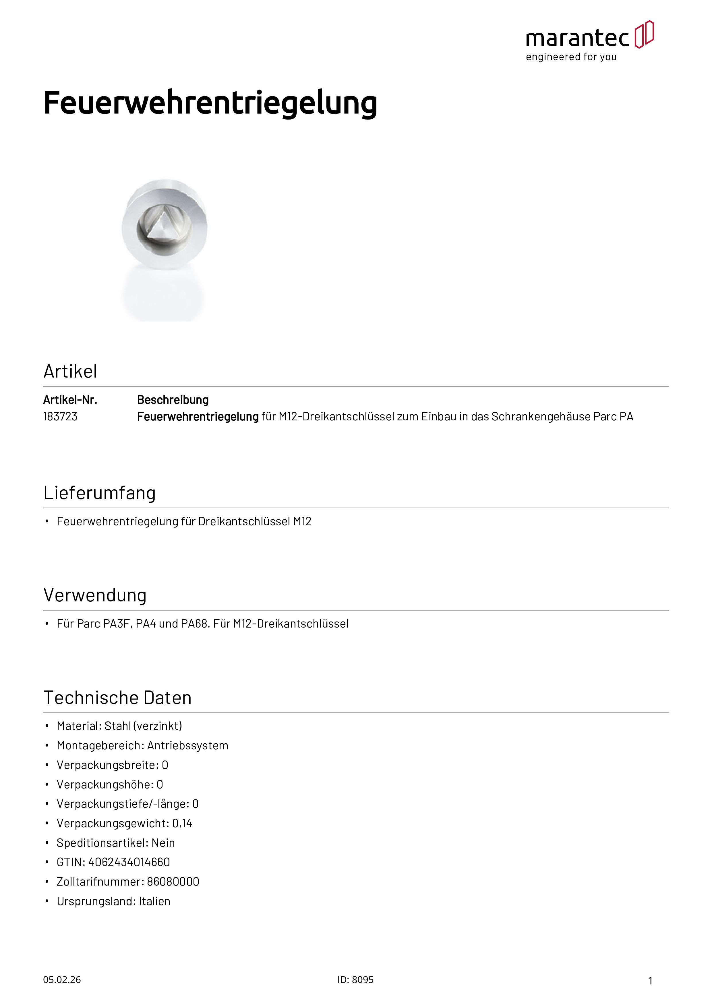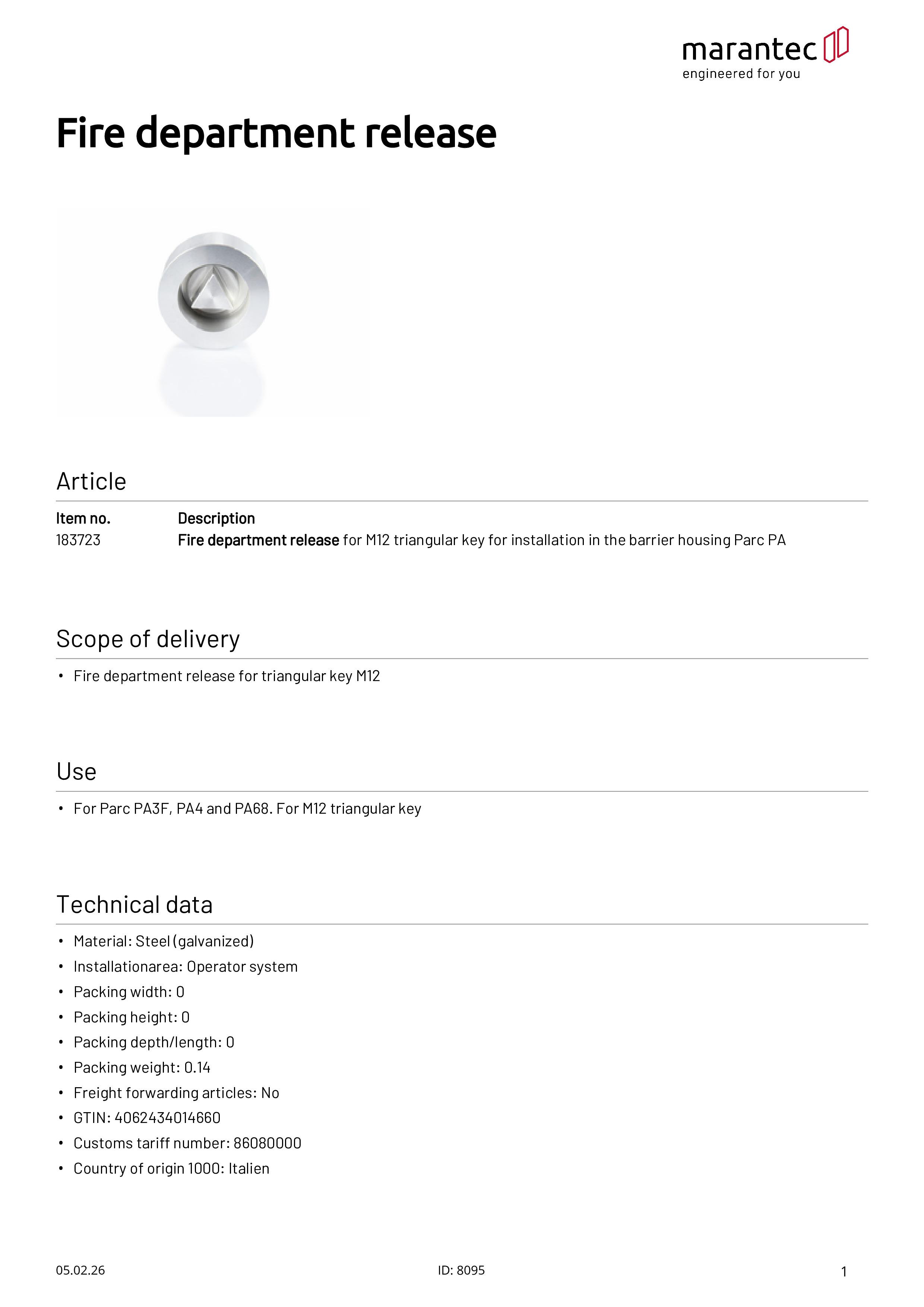 Feuerwehrentriegelung für M12-Dreikantschlüssel für Parc PA