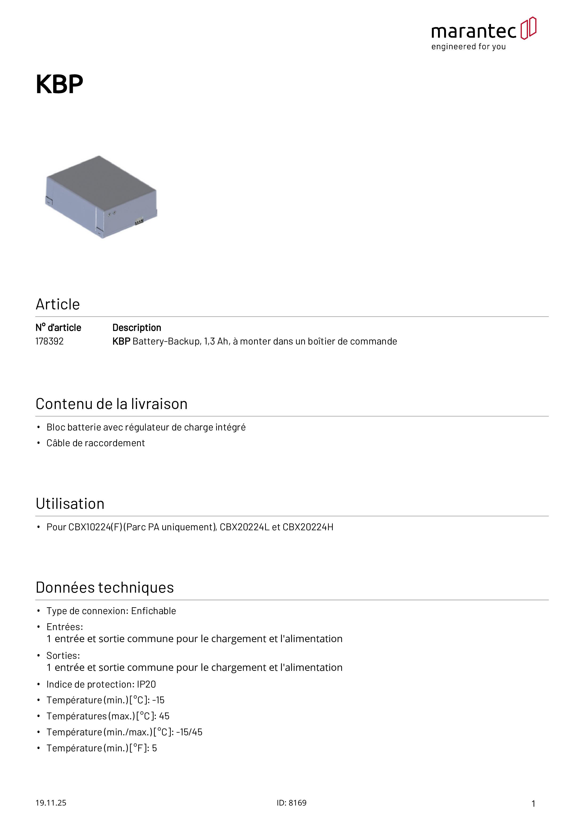 KBP Battery-Backup, 1,3 Ah, zum Einbau in Steuerungsgehäuse CBX