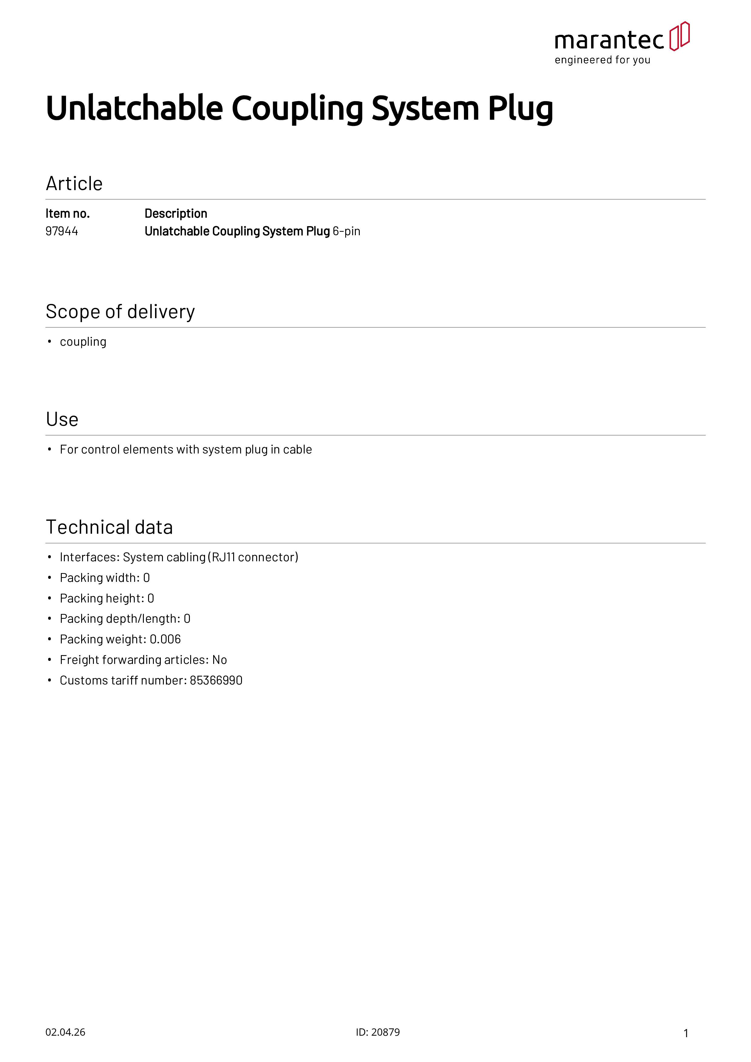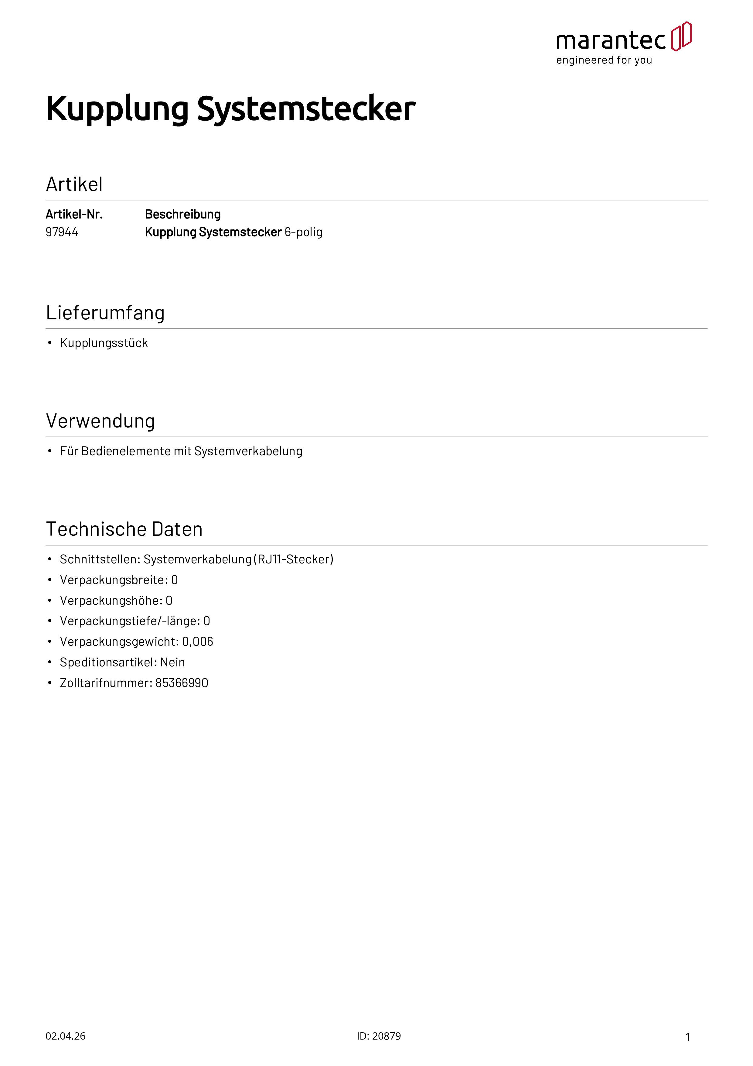 Kupplung Systemstecker 6-polig für Bedienelemente