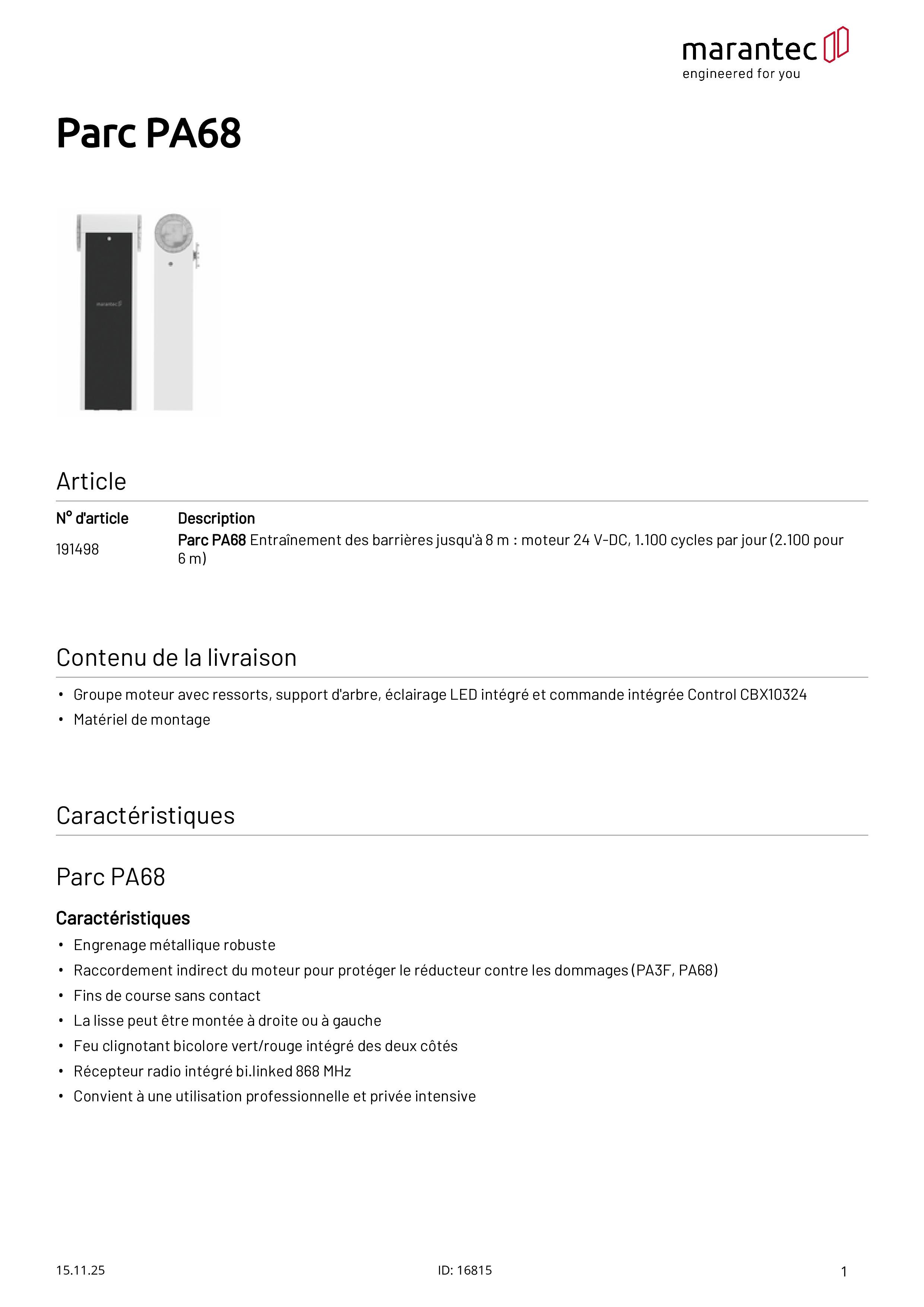 Parc PA68 für Schrankenbäume bis 8 m, 24 V-DC Motor, 1.100 Zyklen pro Tag