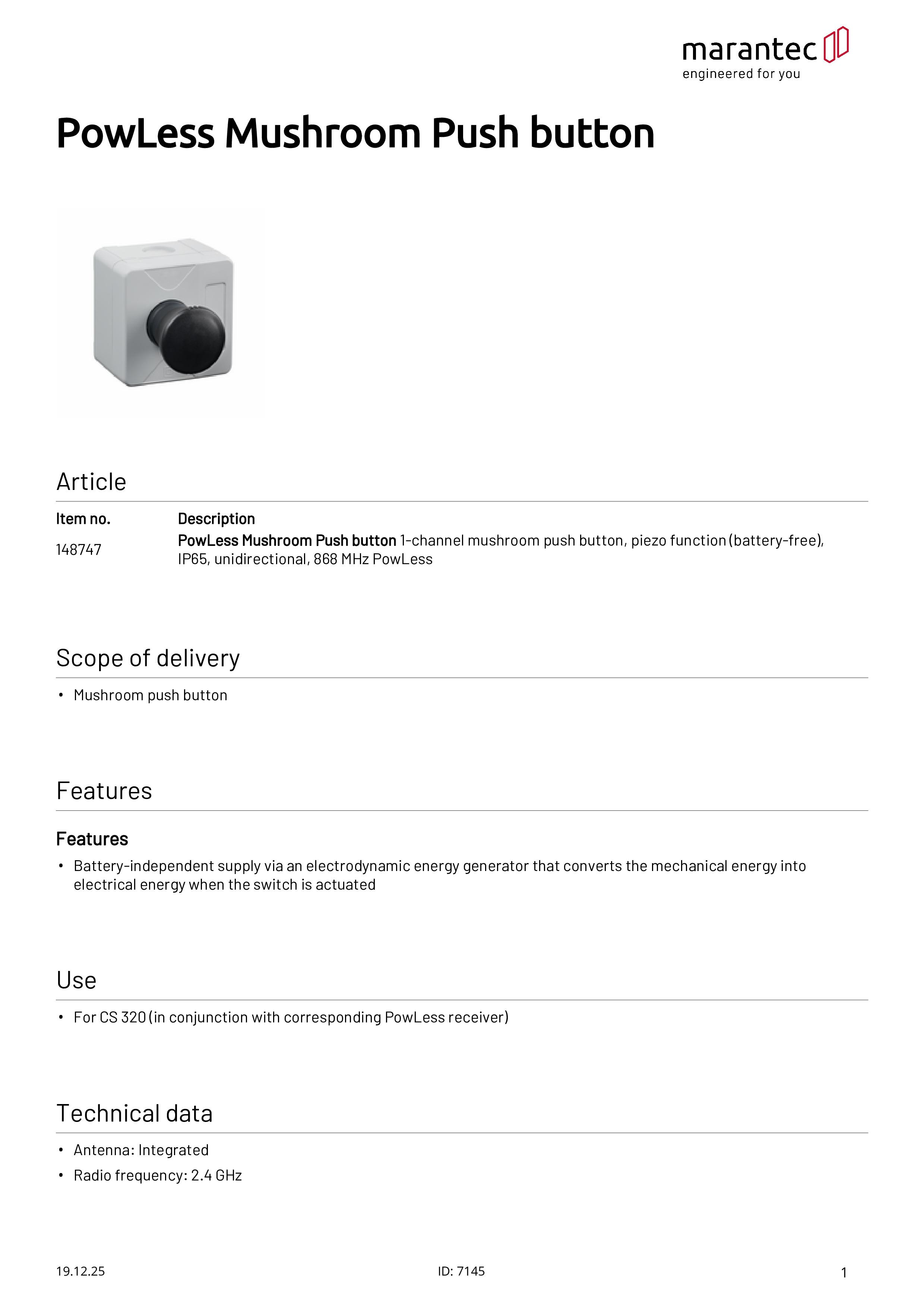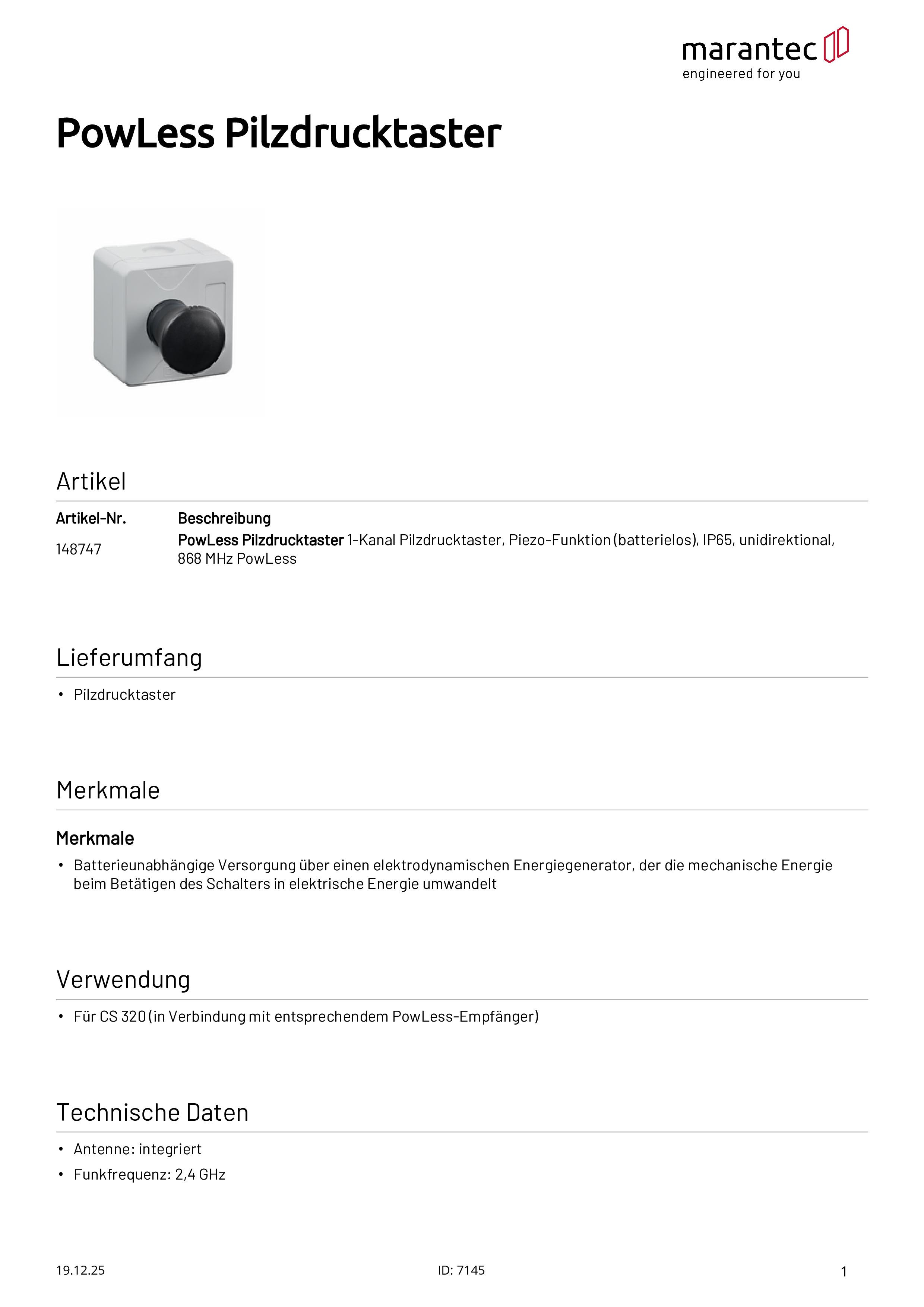 PowLess Pilzdrucktaster Piezo-Funktion (batterielos), IP65, 868 MHz PowLess