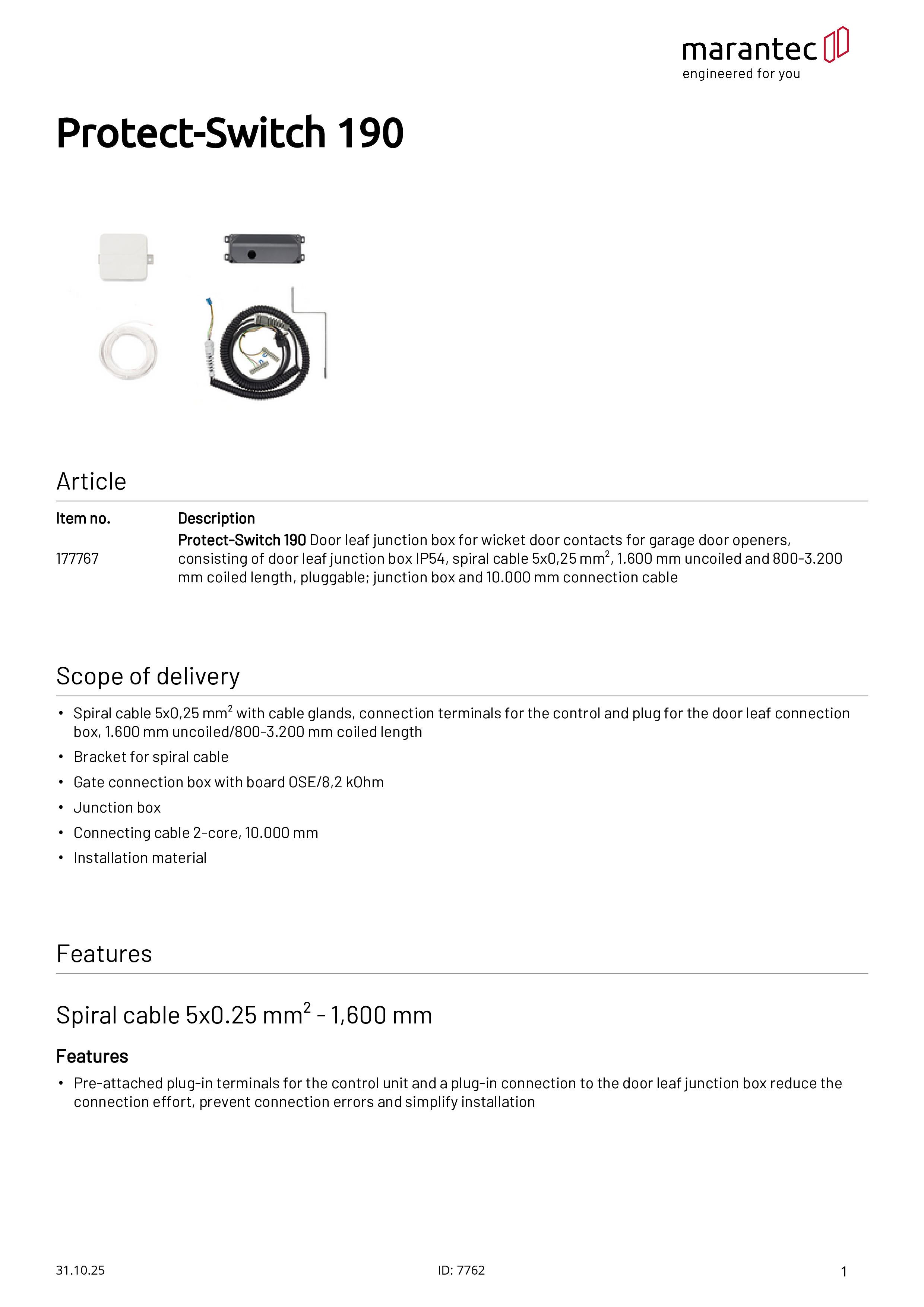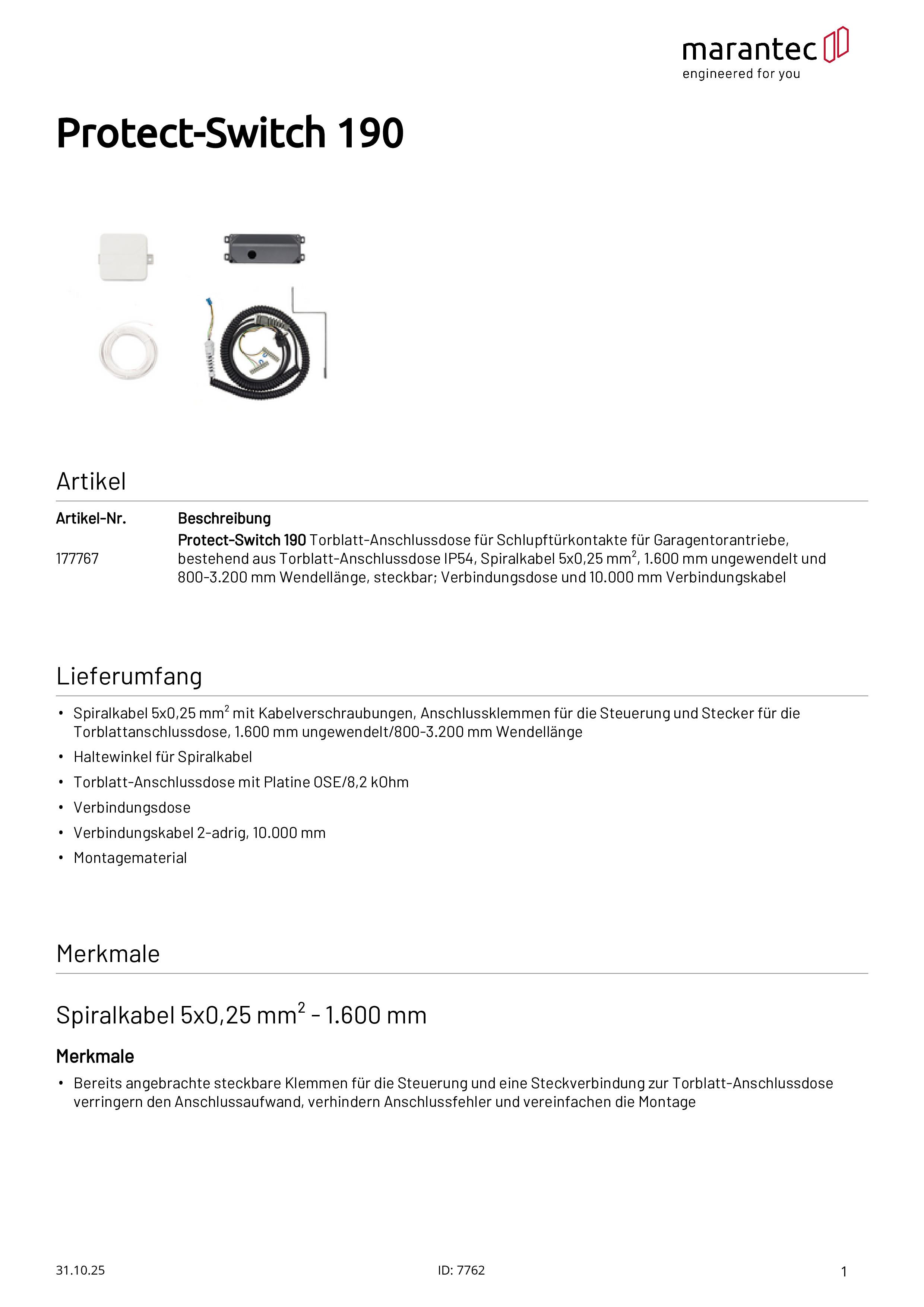 - Spiralkabel 5x0,25 mm² mit Kabelverschraubungen, Anschlussklemmen für die Steuerung und Stecker für die Torblattanschlussdose, 1.600 mm ungewendelt/800-3.200 mm Wendellänge