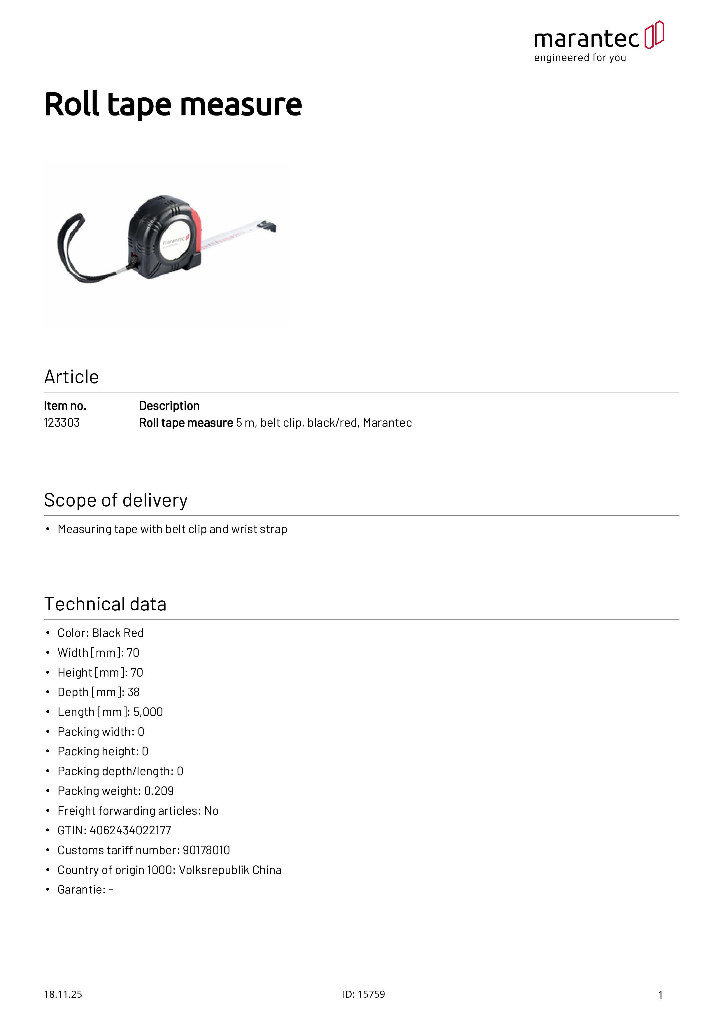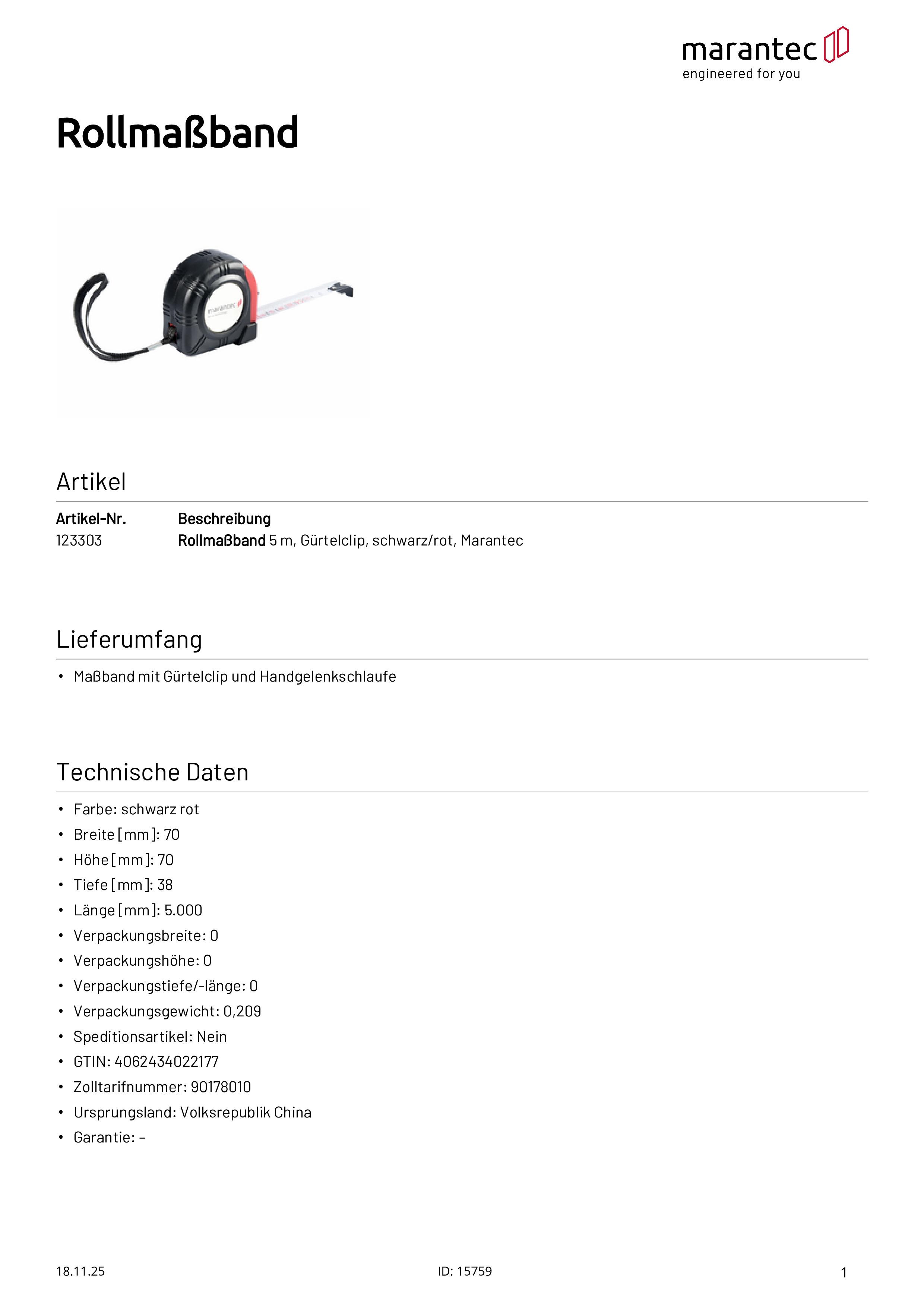 Rollmaßband Marantec 5 m mit Gürtelclip schwarz/rot