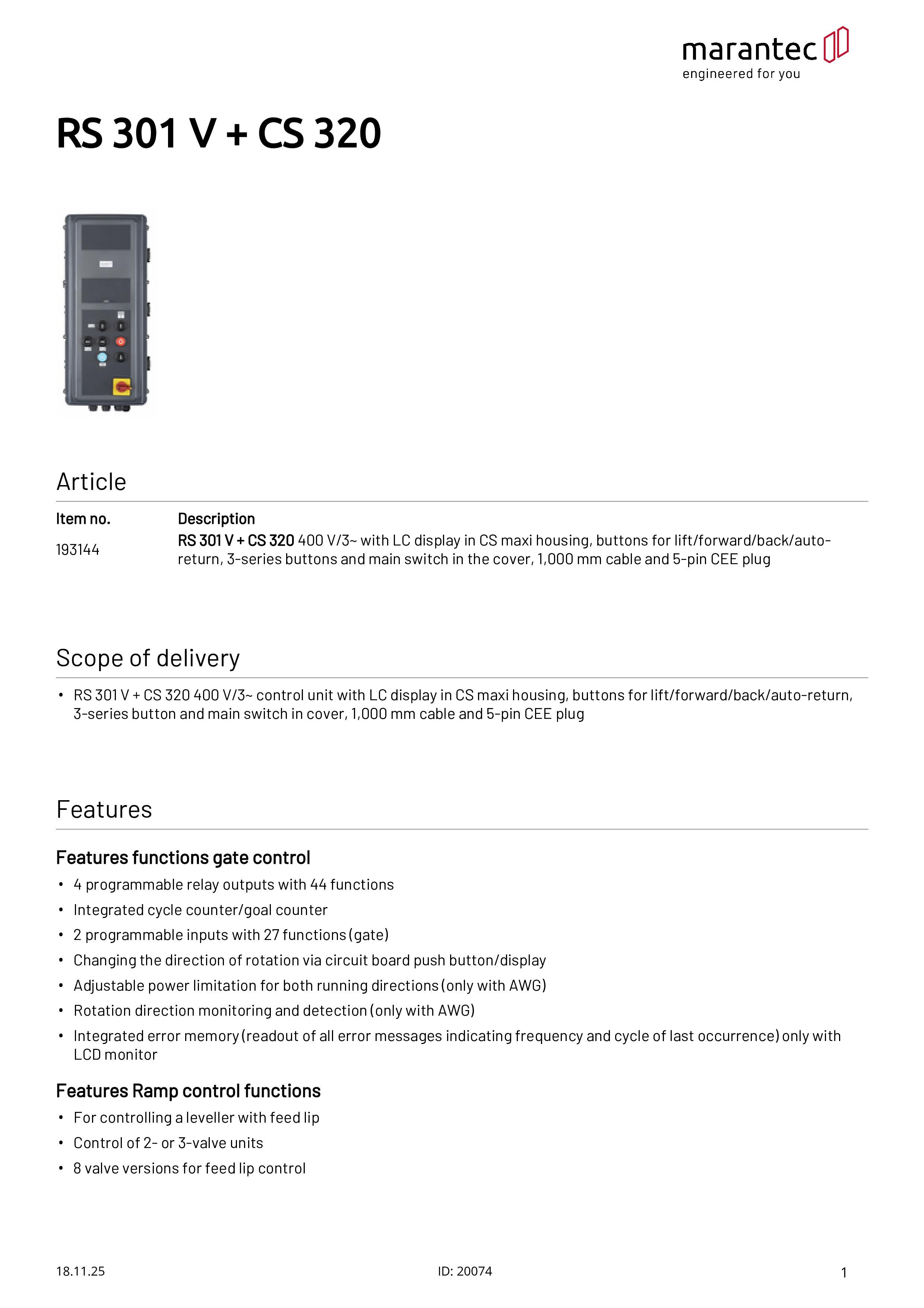 - Steuerung RS 301 V + CS 320 400 V/3~ mit LC-Display im CS-Maxigehäuse, Tasten für Heben/Vor/Zurück/Auto-Return, 3-fach Taster und Hauptschalter im Deckel, 1.000 mm Kabel und CEE-Stecker 5-polig