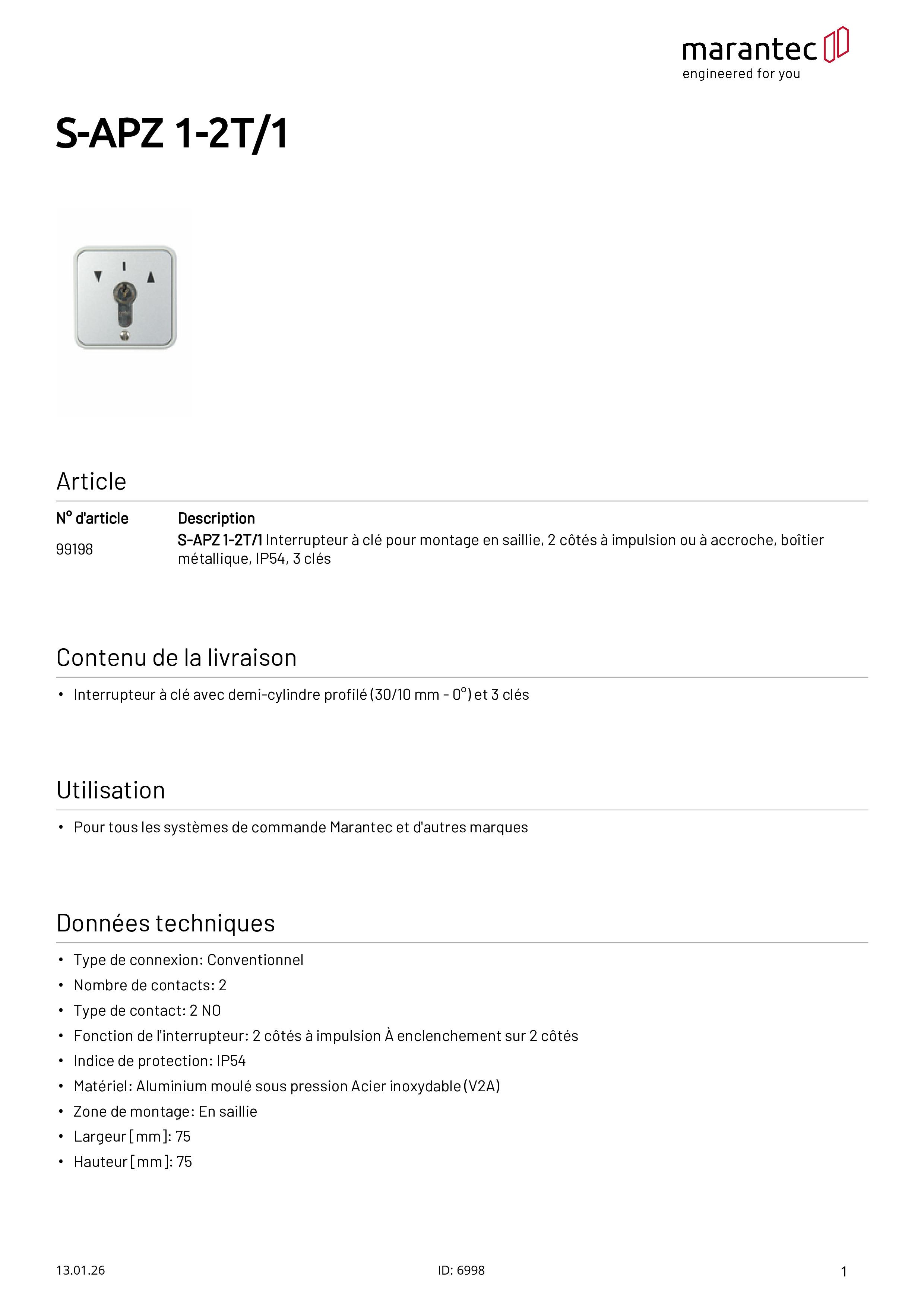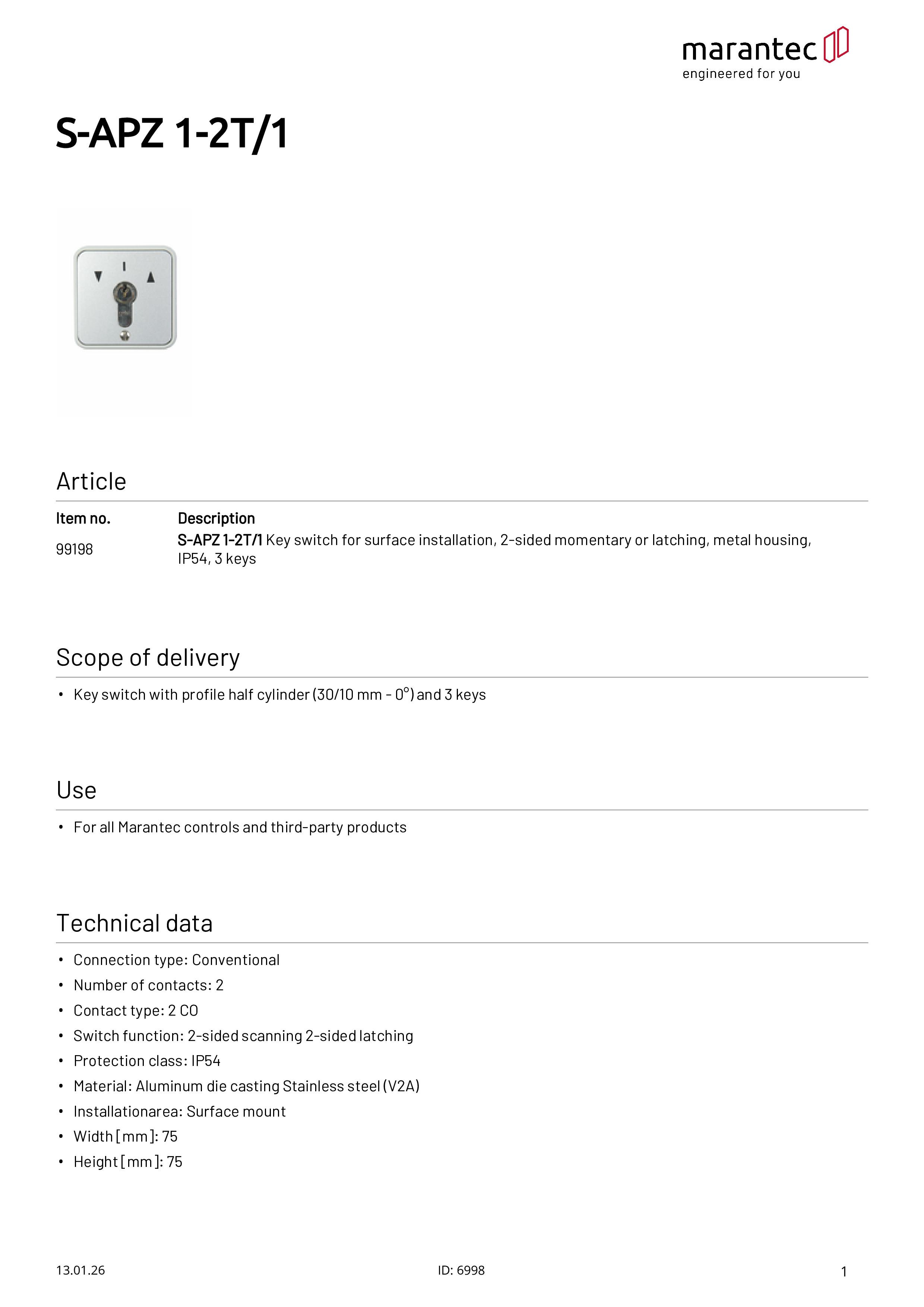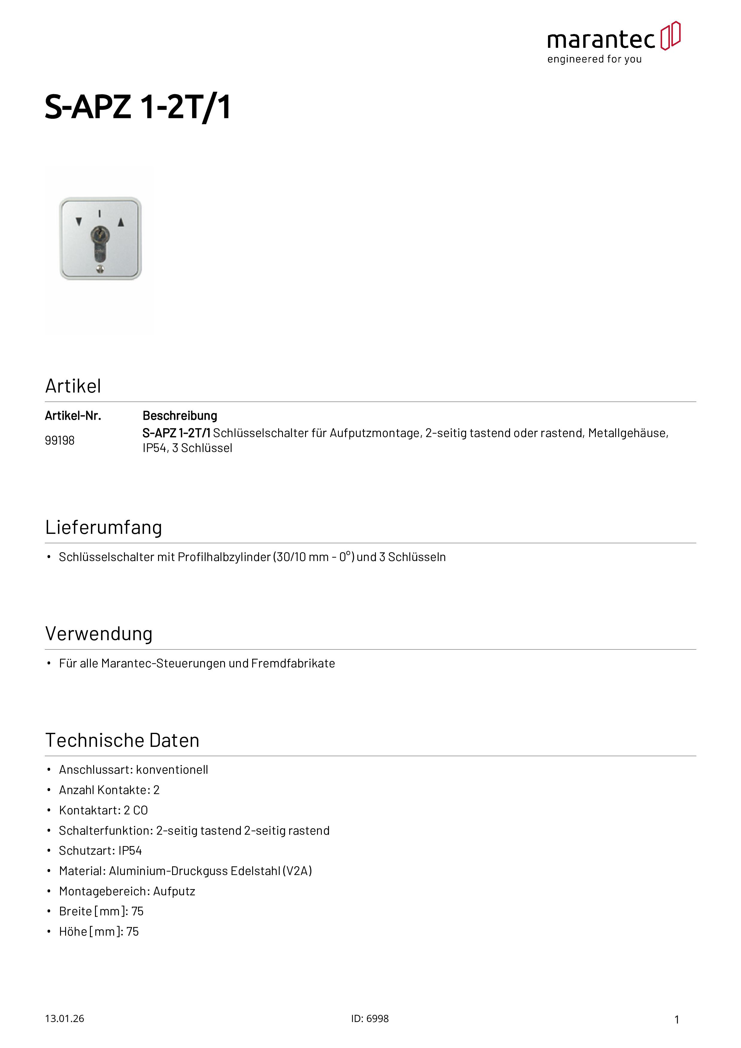 S-APZ 1-2T/1 Schlüsselschalter Aufputz 2-seitig tastend/rastend
