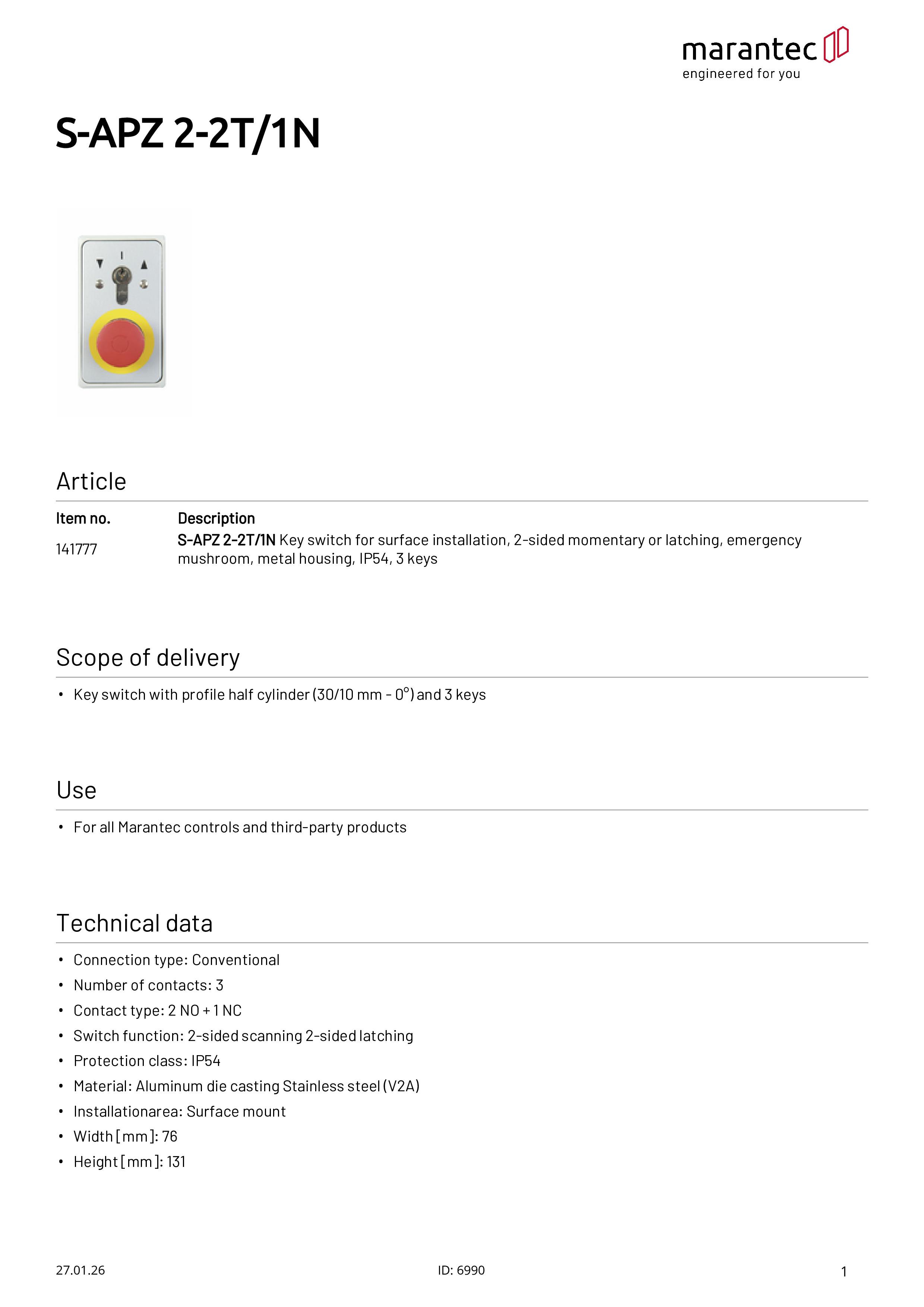 S-APZ 2-2T/1N Schlüsselschalter Aufputz 2-seitig tastend/rastend mit Not-Schlagpilz