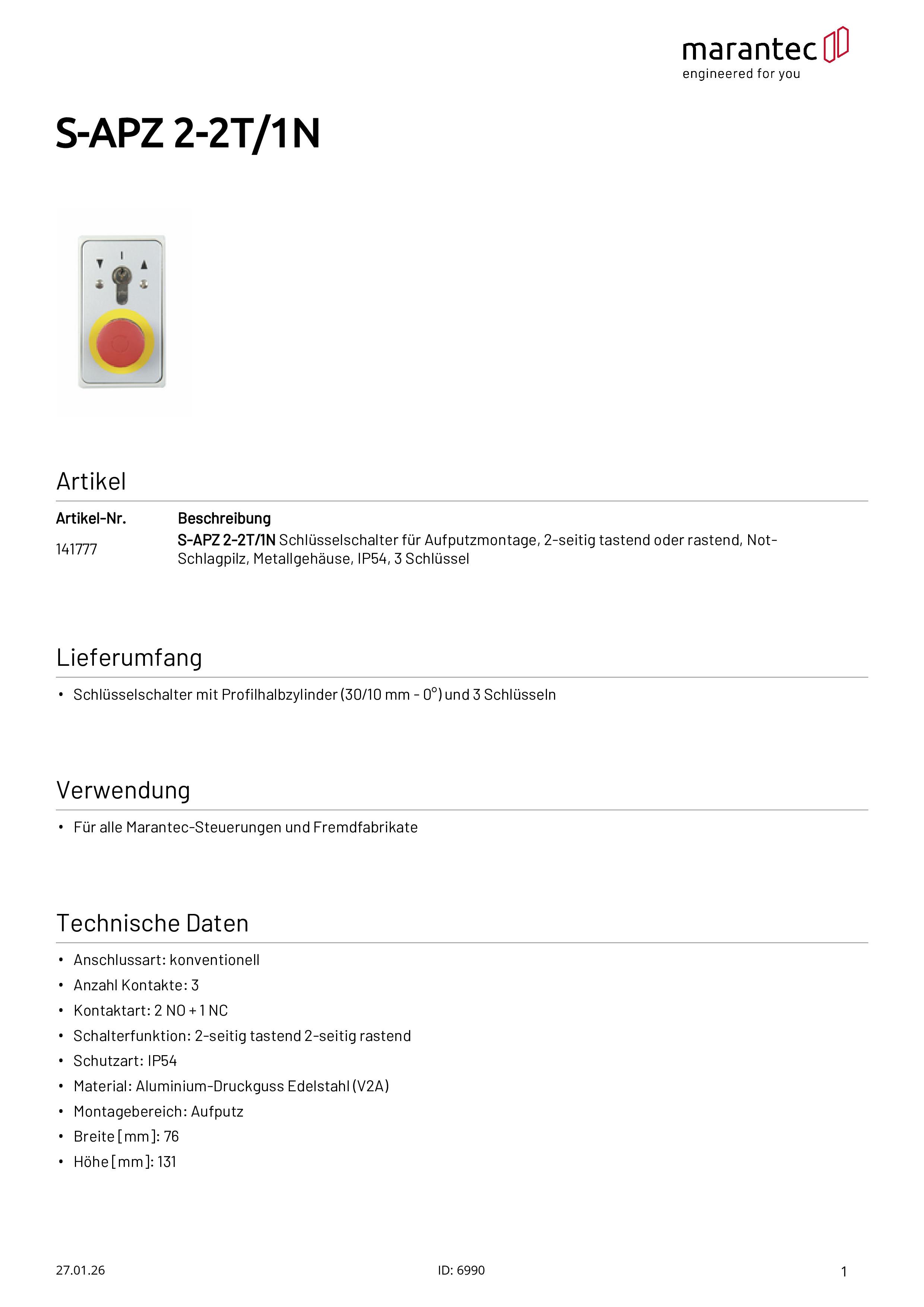 - Schlüsselschalter mit Profilhalbzylinder (30/10 mm - 0°) und 3 Schlüsseln