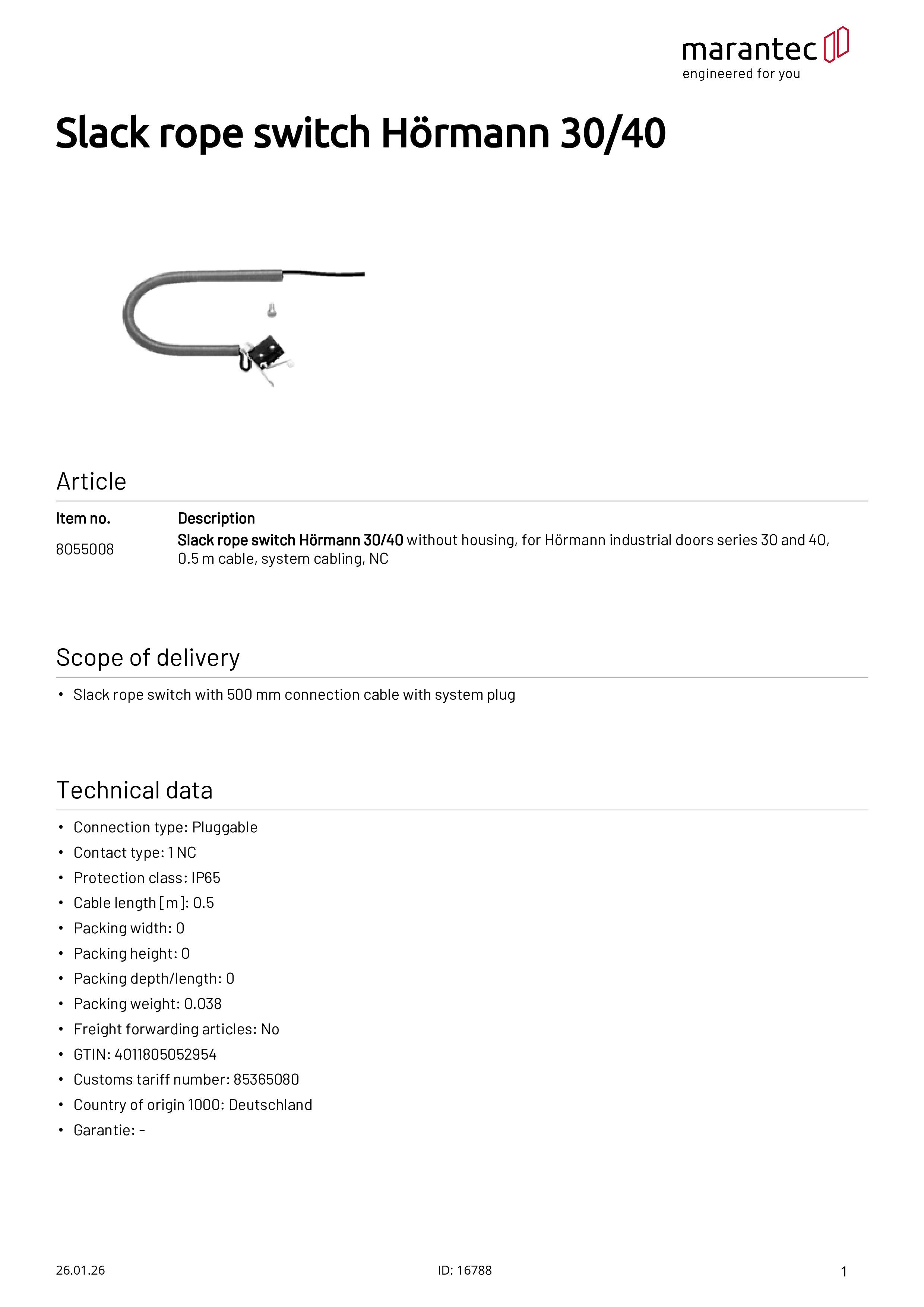 Schlaffseilschalter Hörmann 30/40 Baureihe, ohne Gehäuse, 0,5 m Kabel, Systemverkabelung
