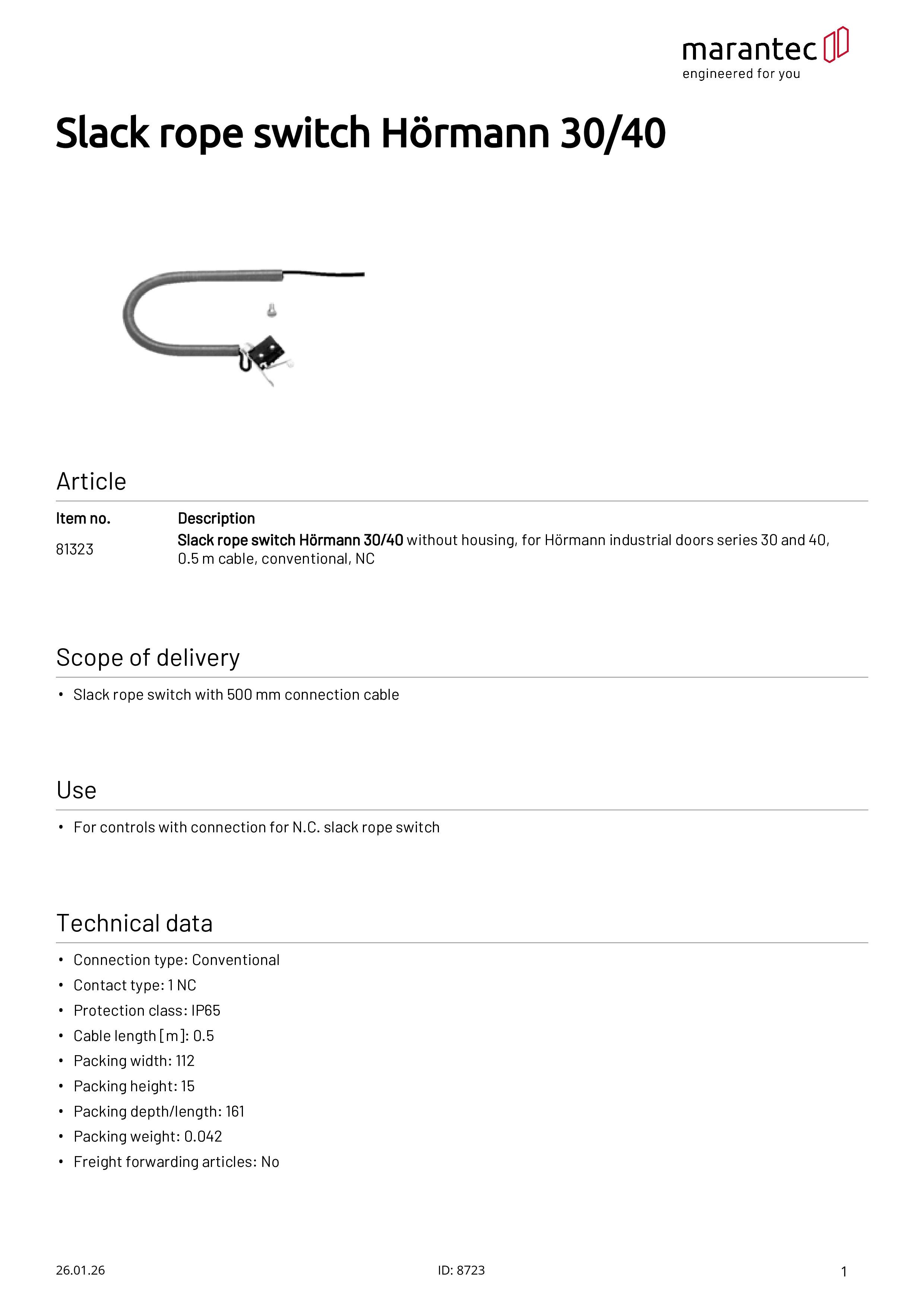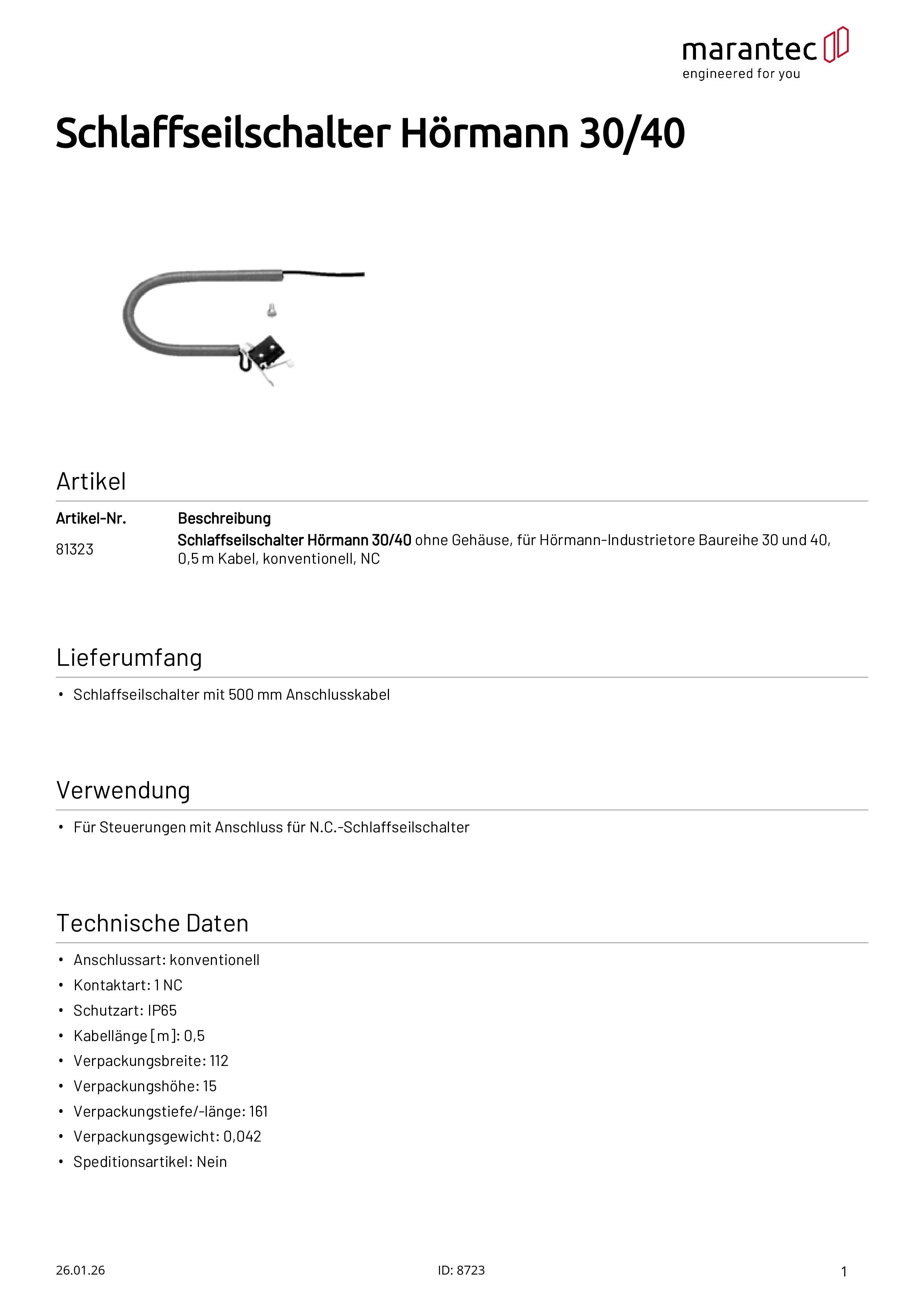 Schlaffseilschalter Hörmann 30/40 Baureihe, ohne Gehäuse, 0,5 m Kabel, konventionell