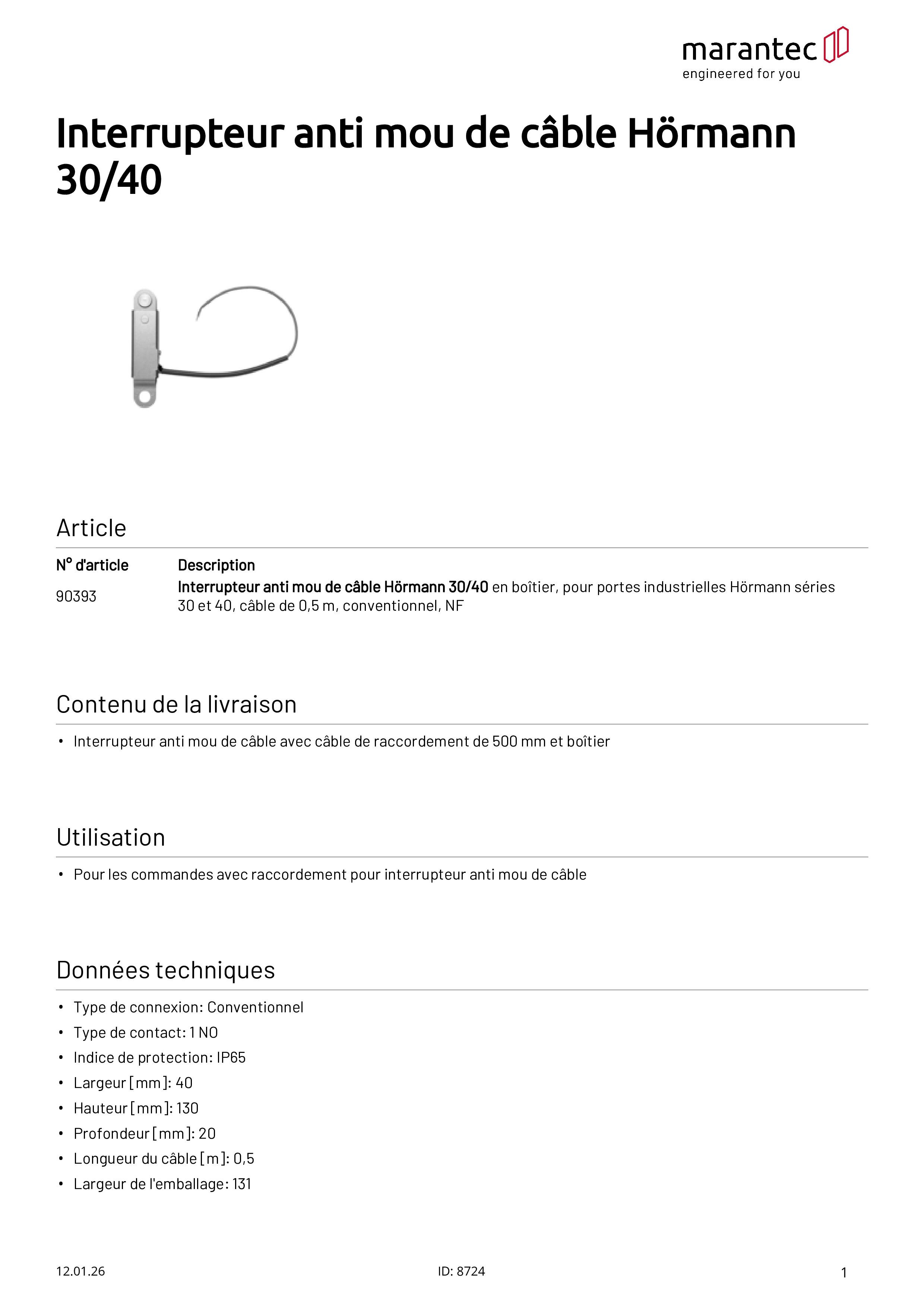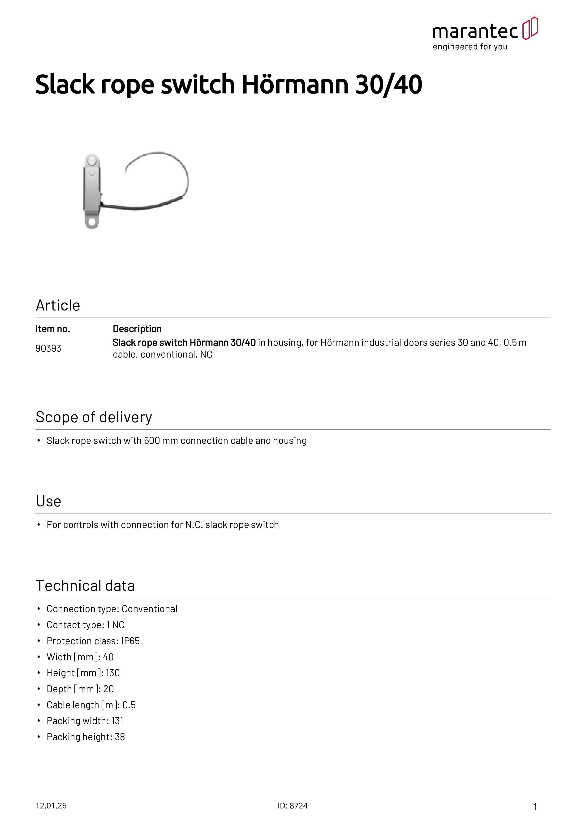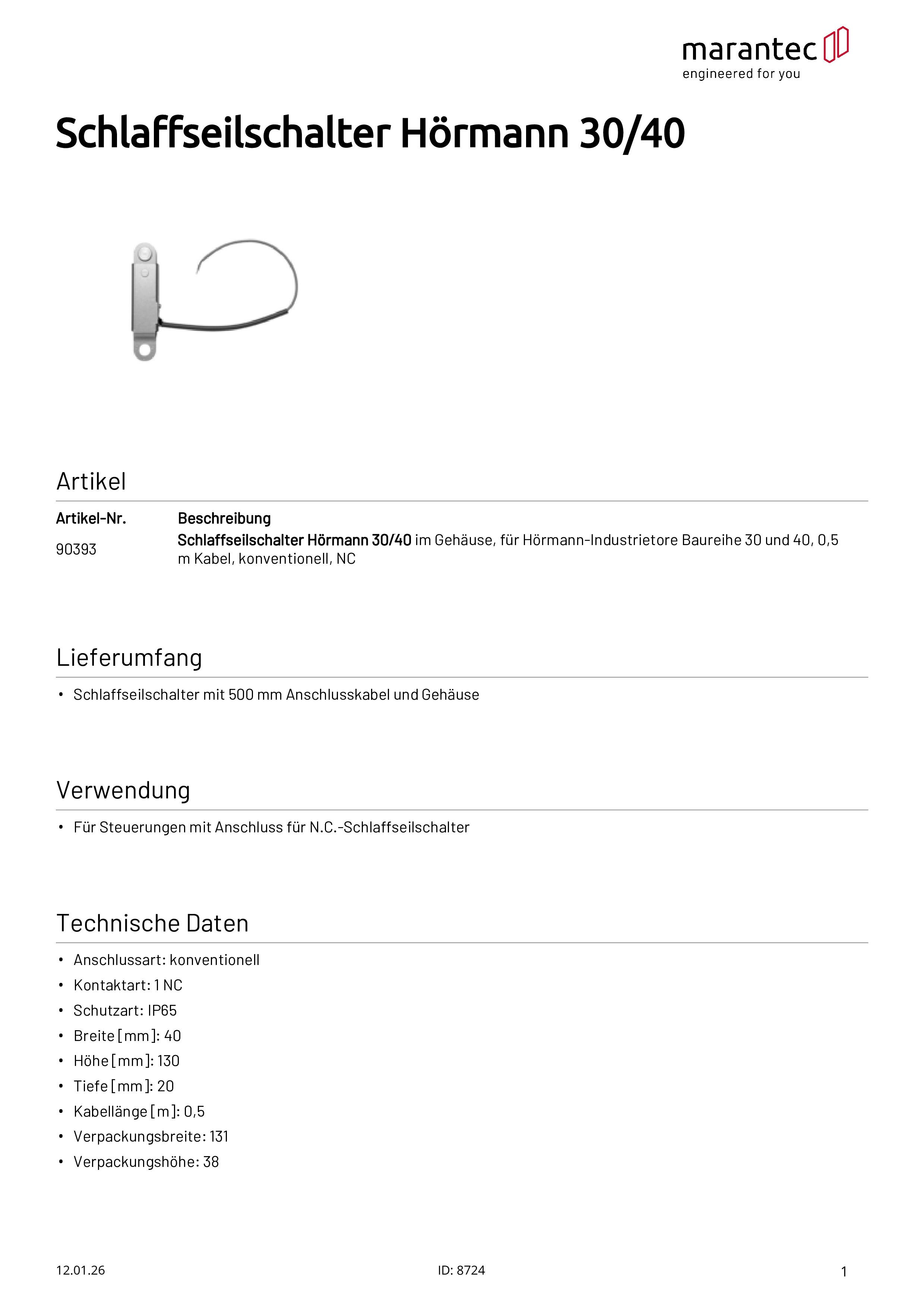 Schlaffseilschalter Hörmann Baureihe 30/40, im Gehäuse, 0,5 m Kabel, konventionell