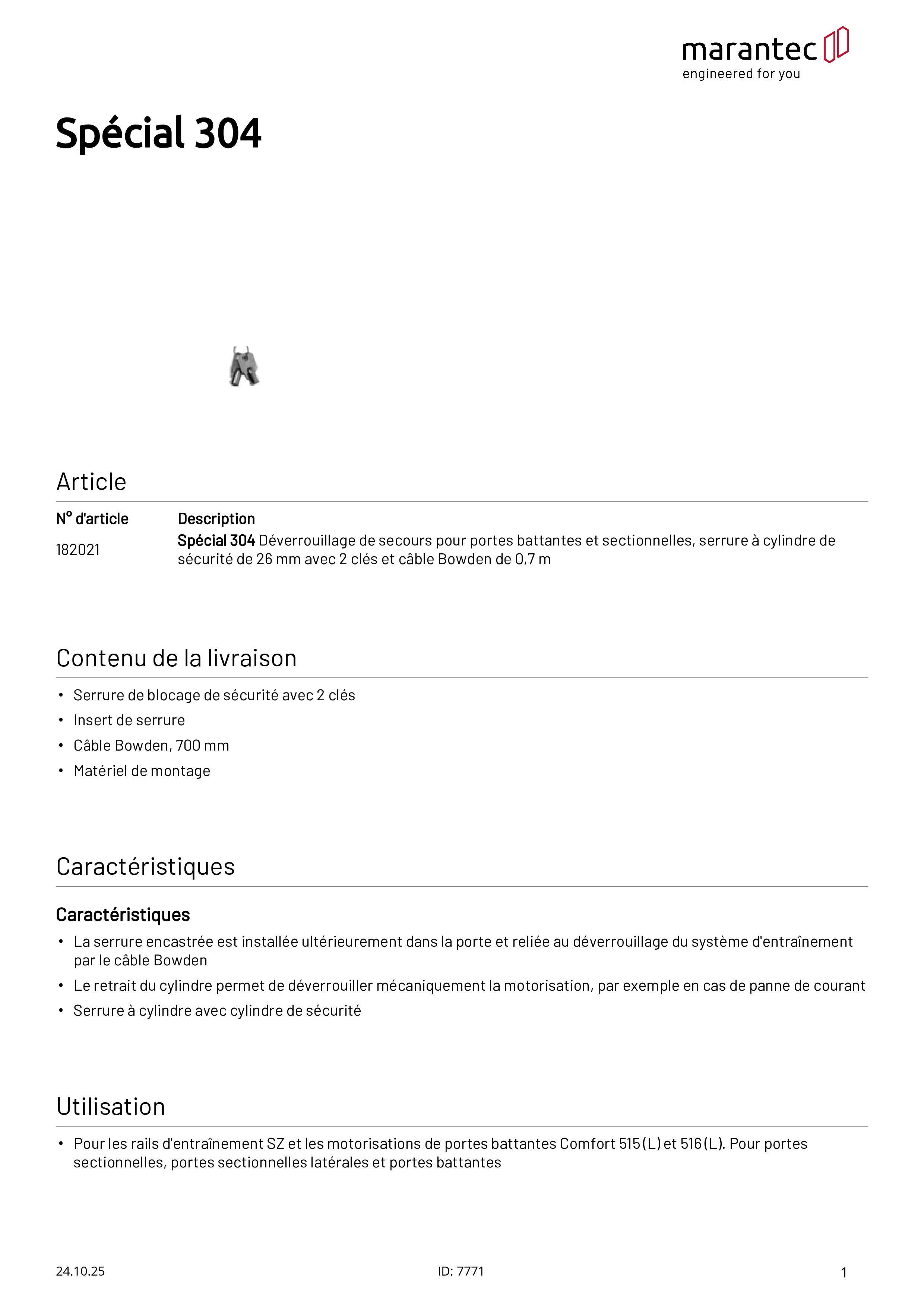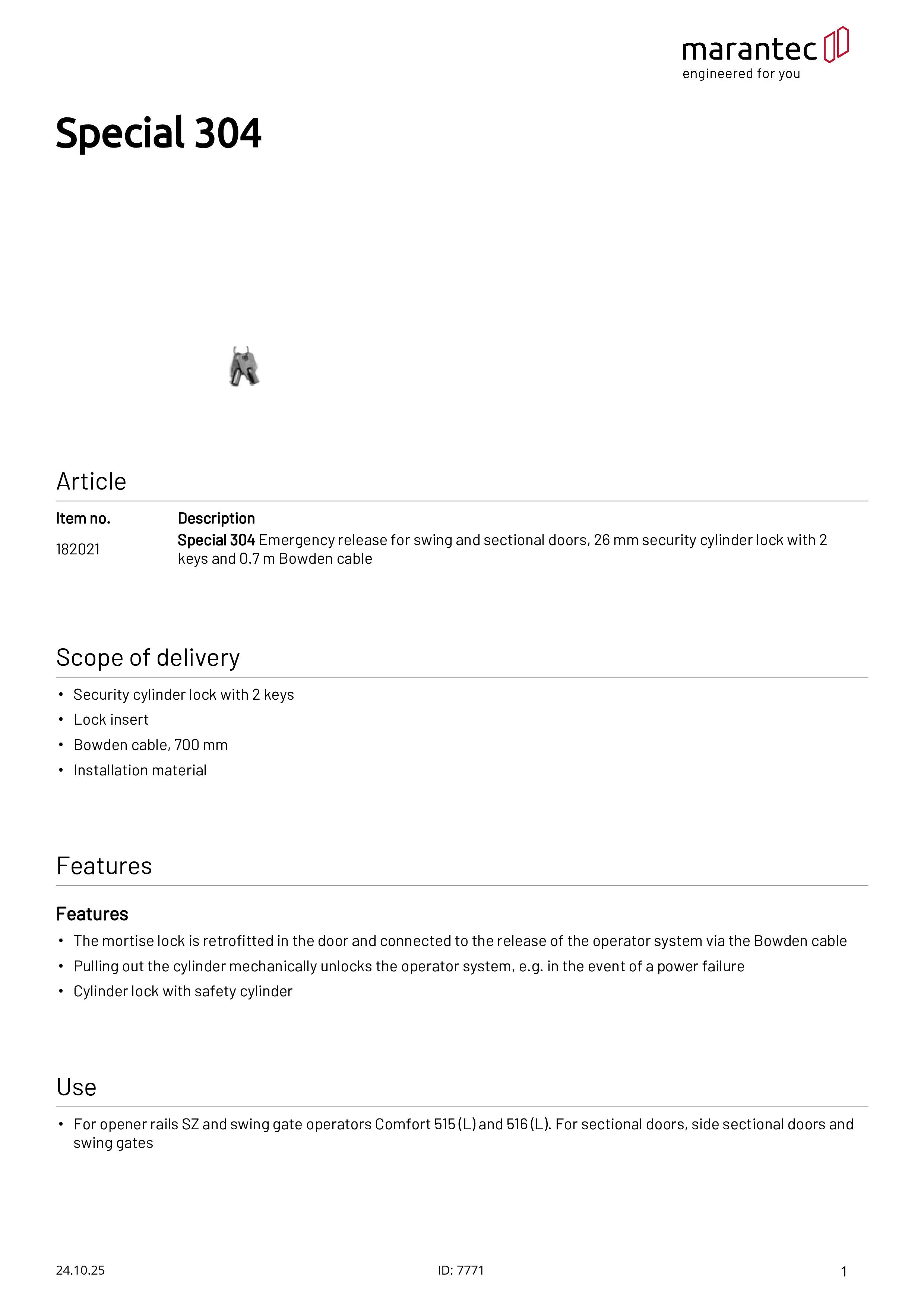 Special 304 Notentriegelung für Dreh-/Sektionaltore mit 0,7 m Bowdenzug