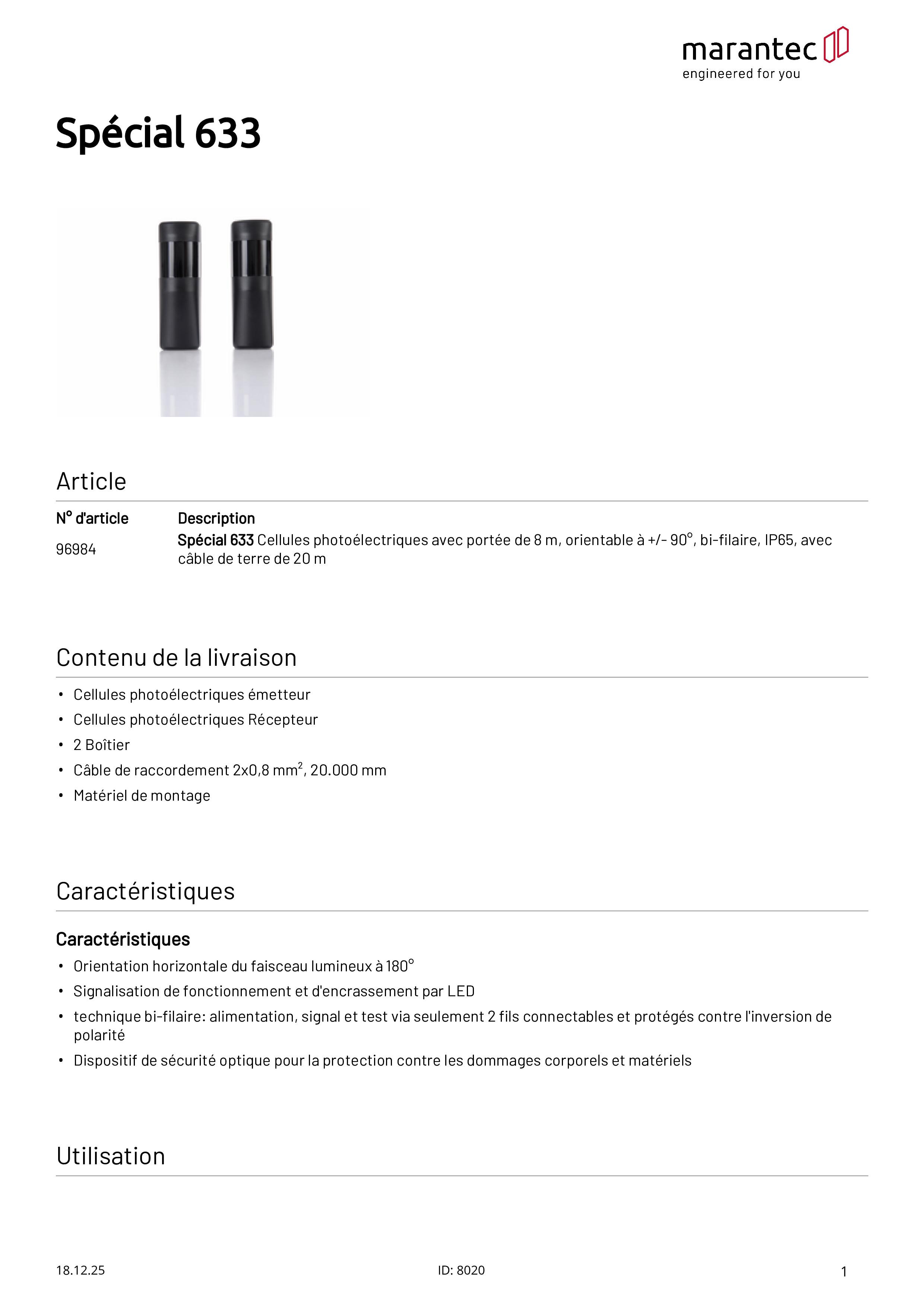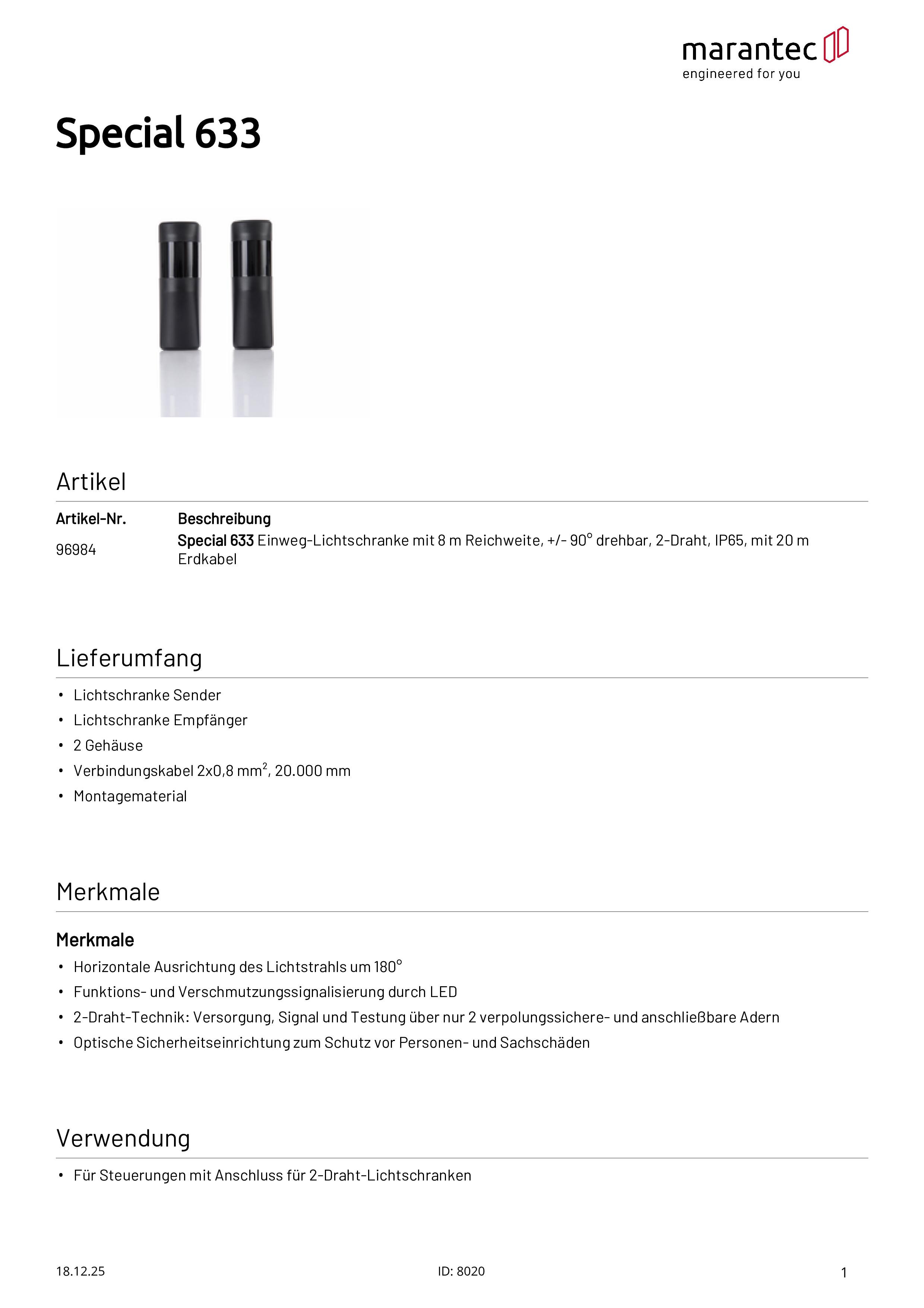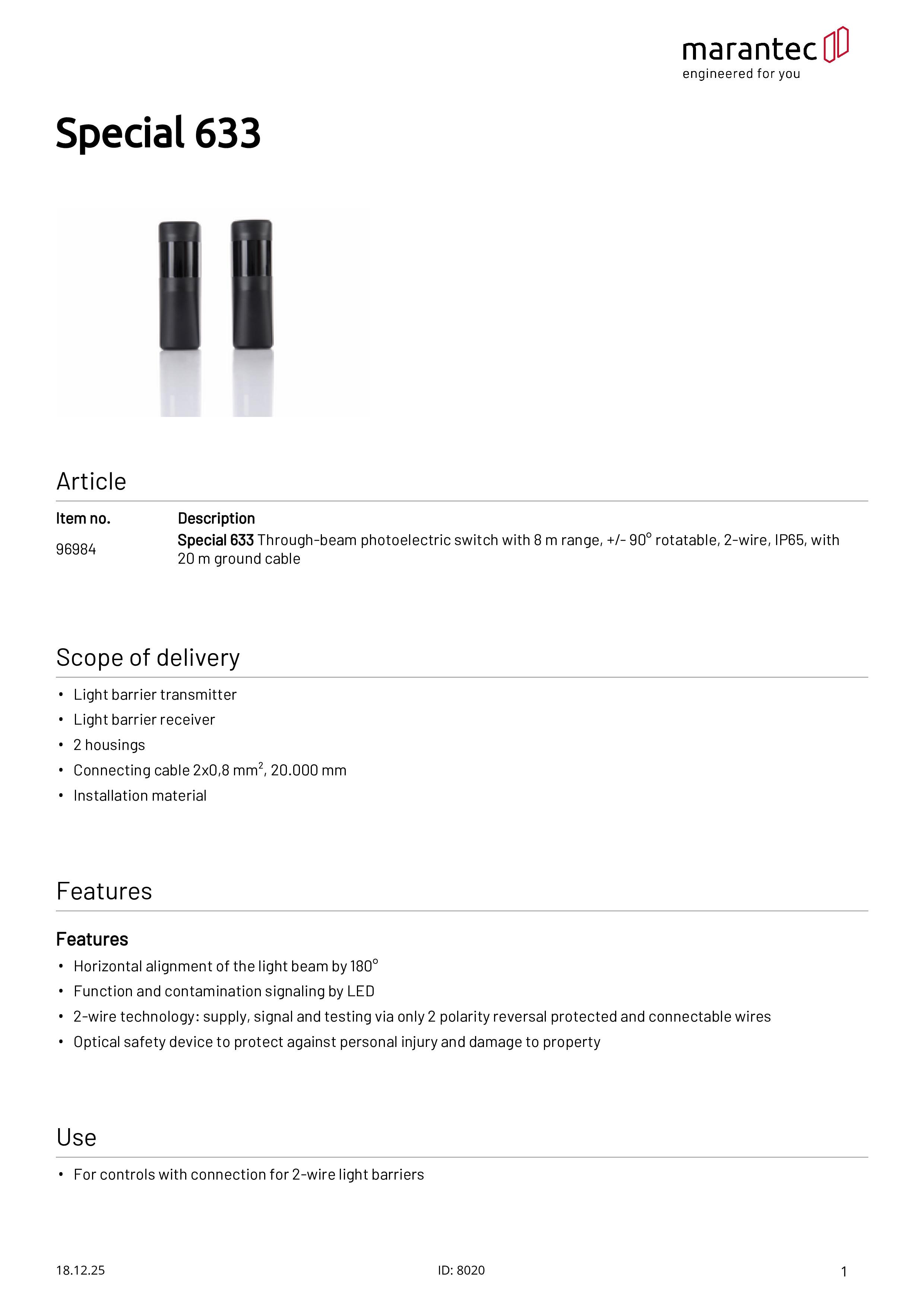 Special 633 Einweg-Lichtschranke mit 8 m Reichweite, 2-Draht, 20 m Kabel