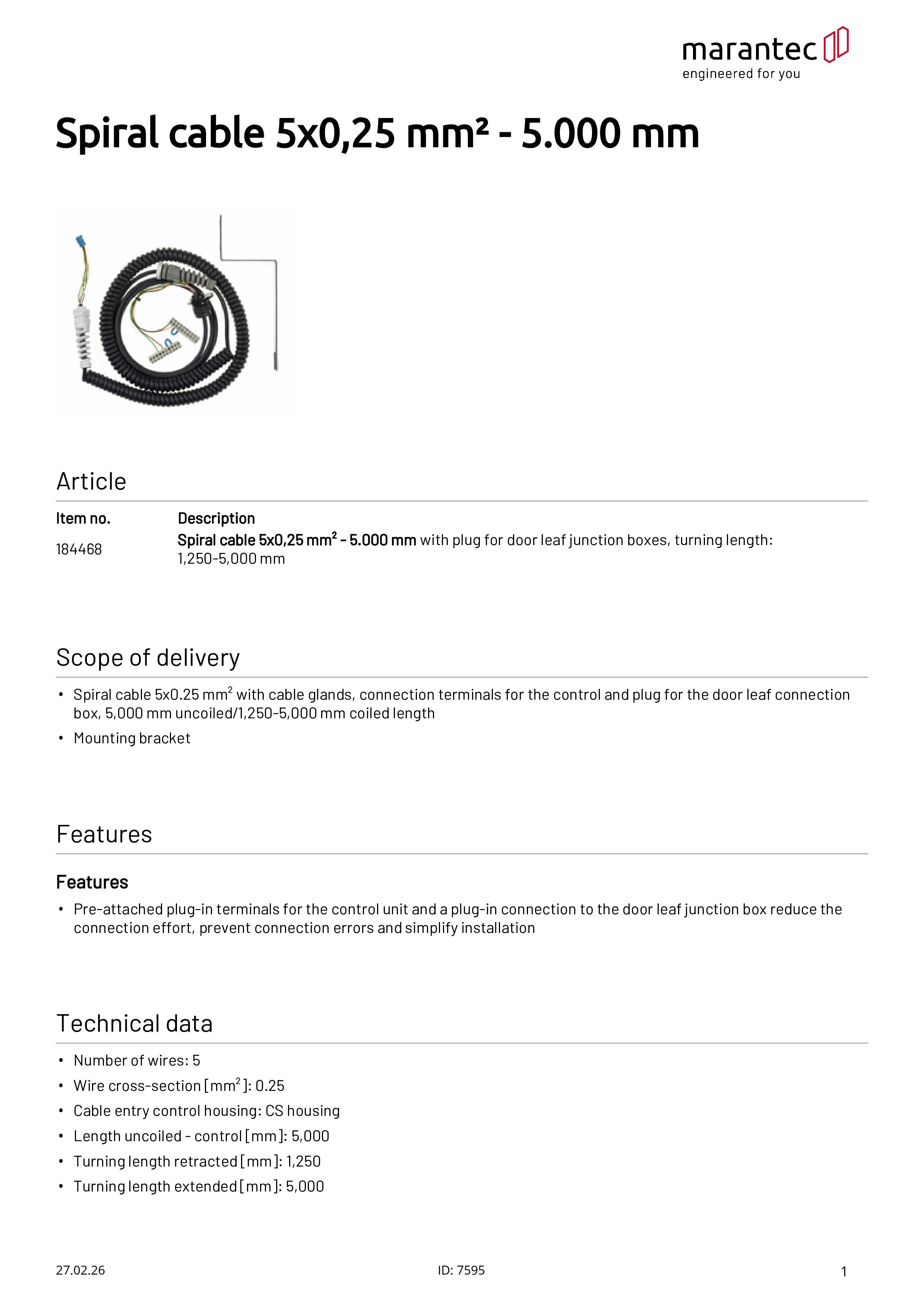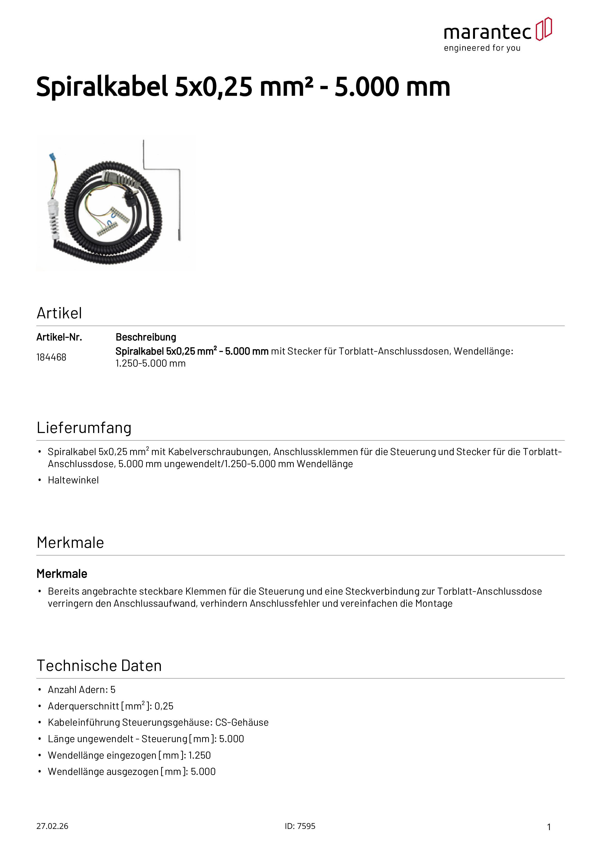 - Spiralkabel 5x0,25 mm² mit Kabelverschraubungen, Anschlussklemmen für die Steuerung und Stecker für die Torblatt-Anschlussdose, 5.000 mm ungewendelt/1.250-5.000 mm Wendellänge