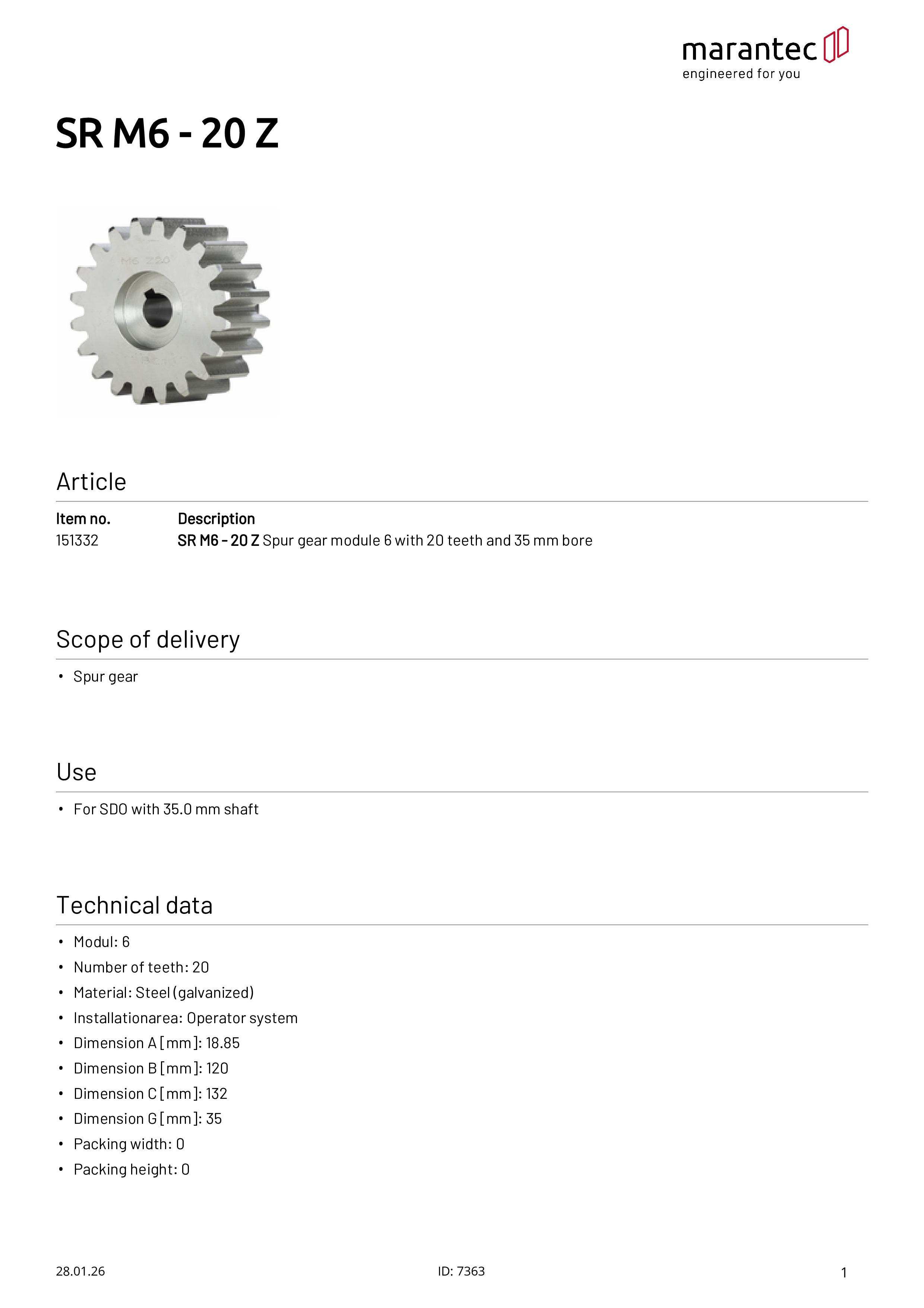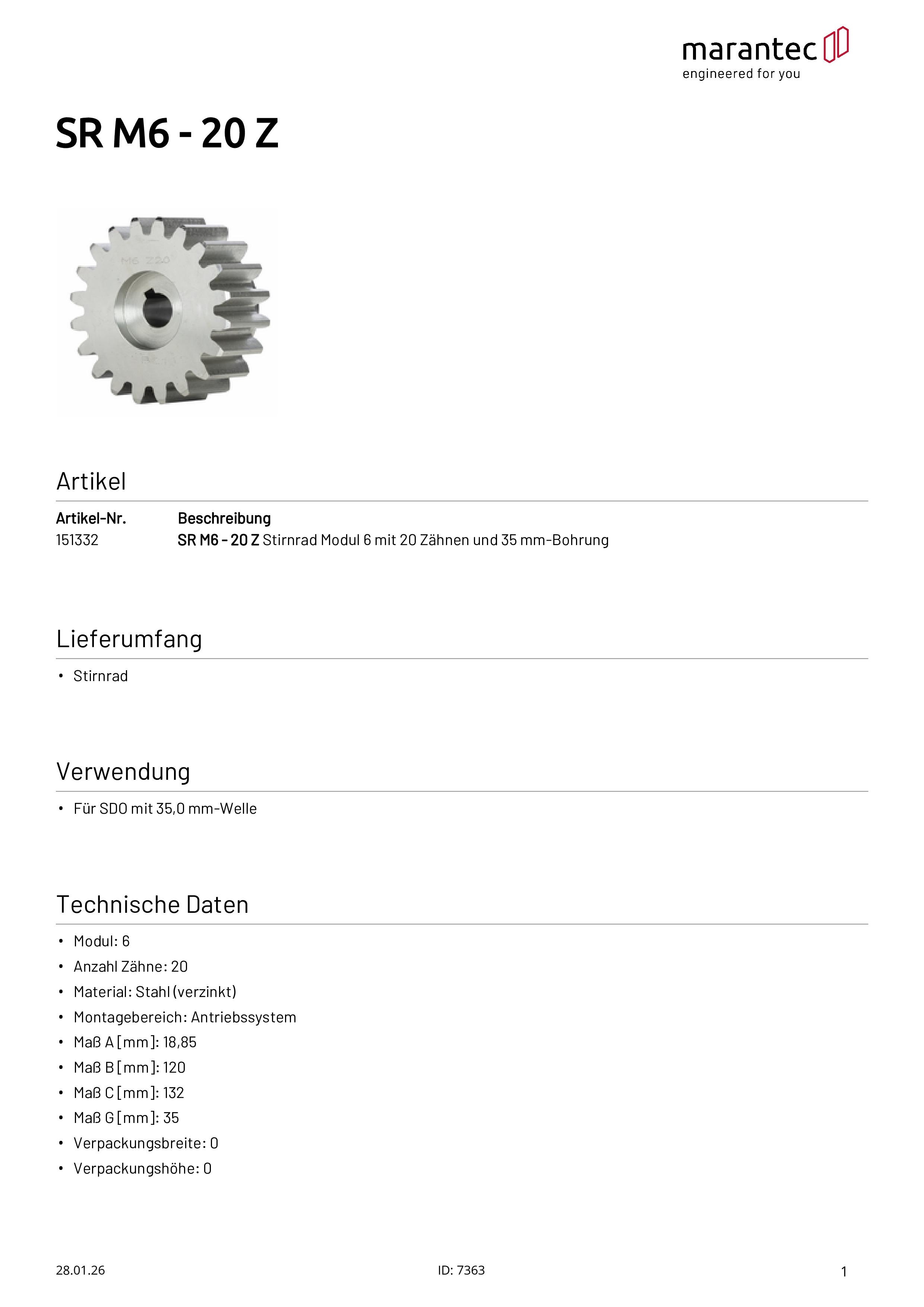 SR M6 - 20 Z Stirnrad Modul 6 mit 20 Zähnen und 35 mm-Bohrung