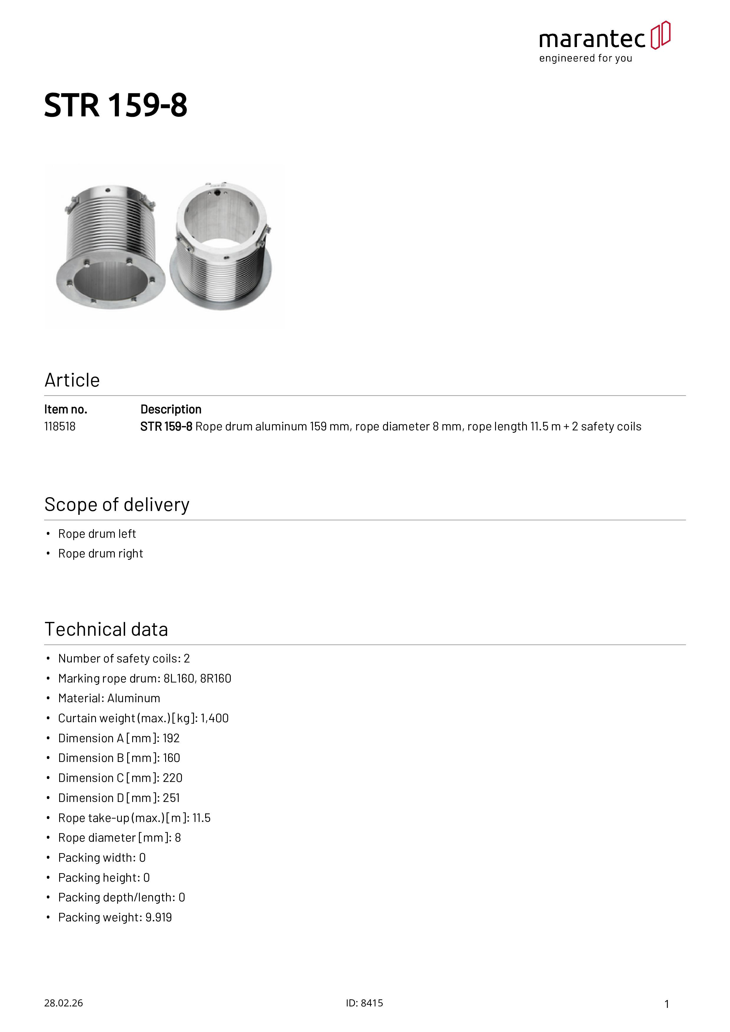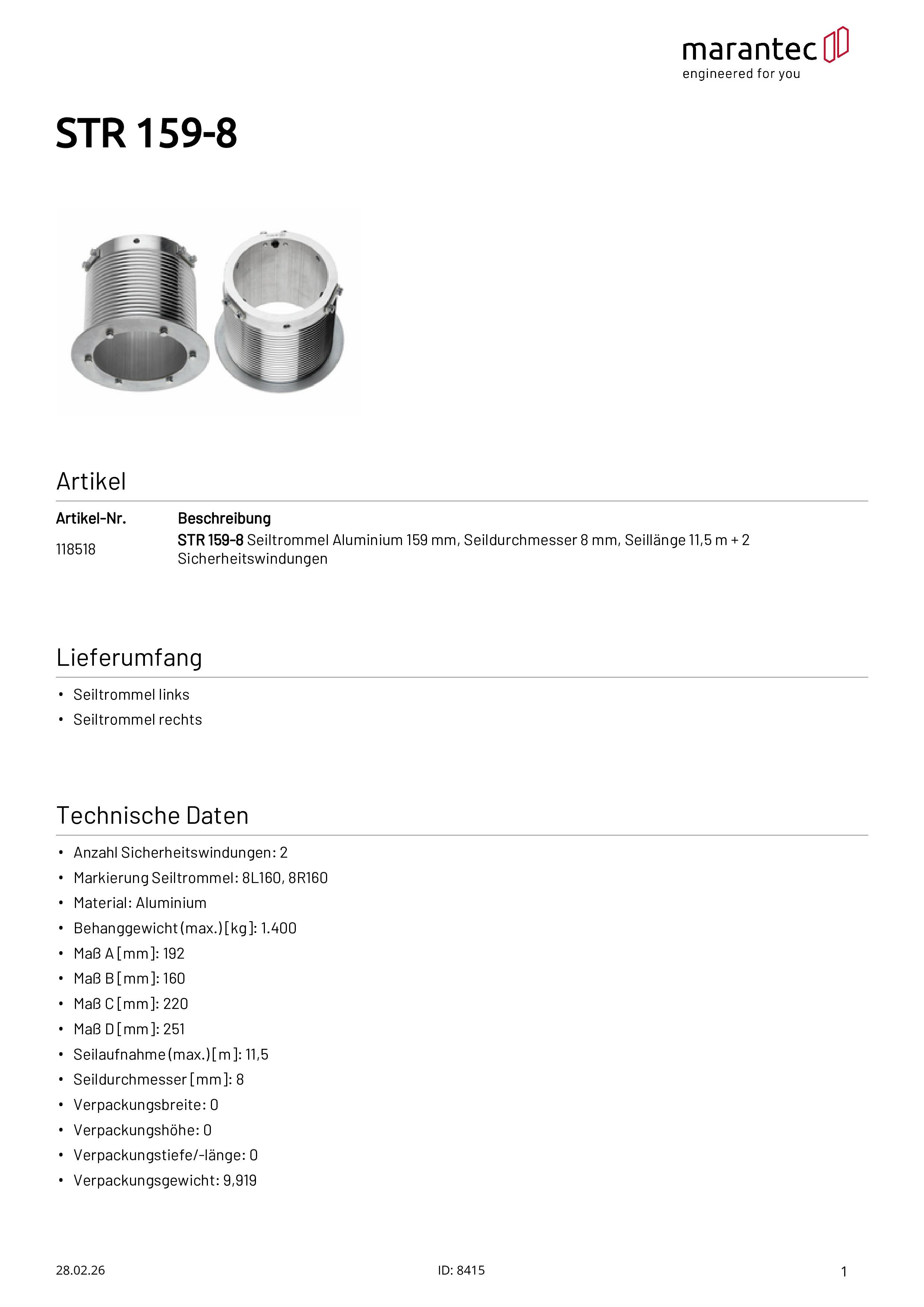STR 159-8 Seiltrommel Aluminium 159 mm, Seil Ø 8 mm, Seillänge 11,5 m