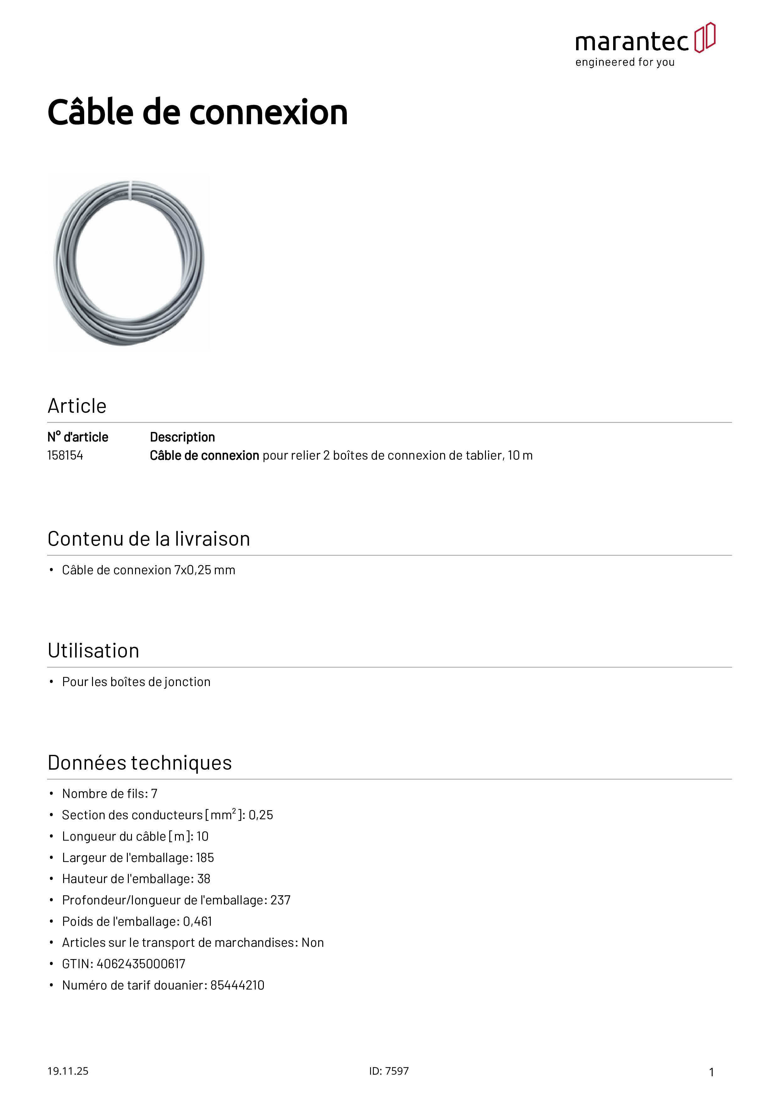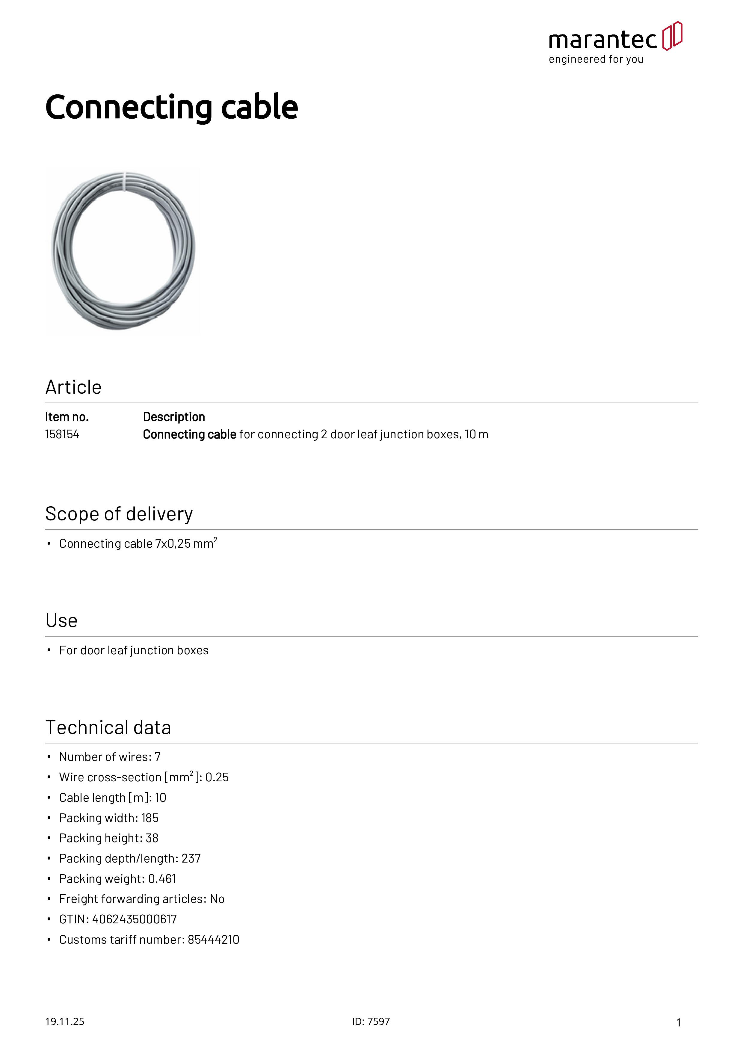 Verbindungskabel zur Verbindung von zwei Torblatt-Anschlussdosen, 10 m