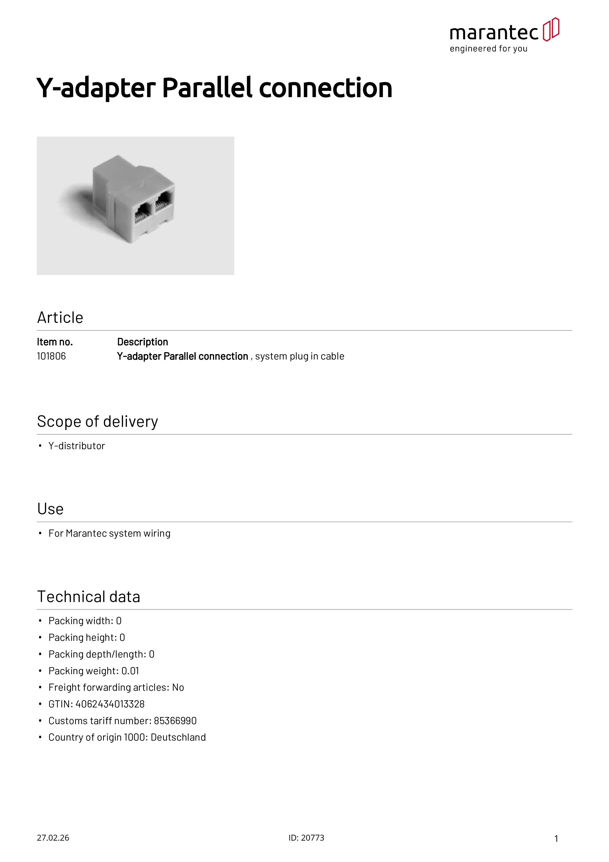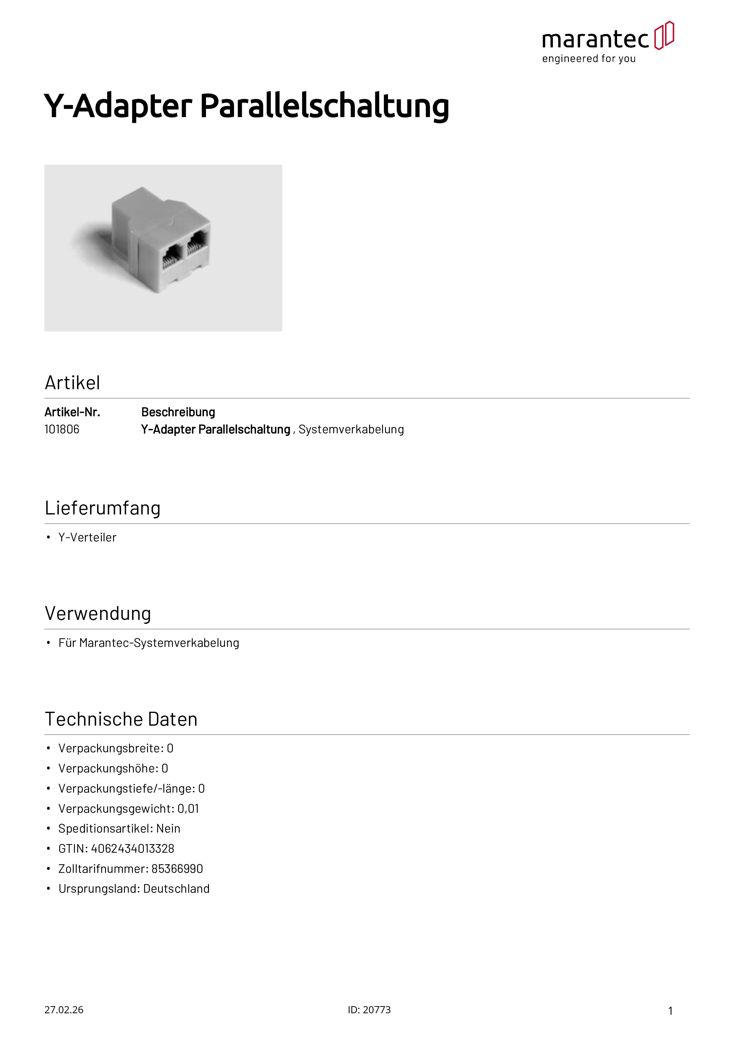 Y-Adapter für Parallelschaltung von Befehlsgeräten mit Systemverkabelung