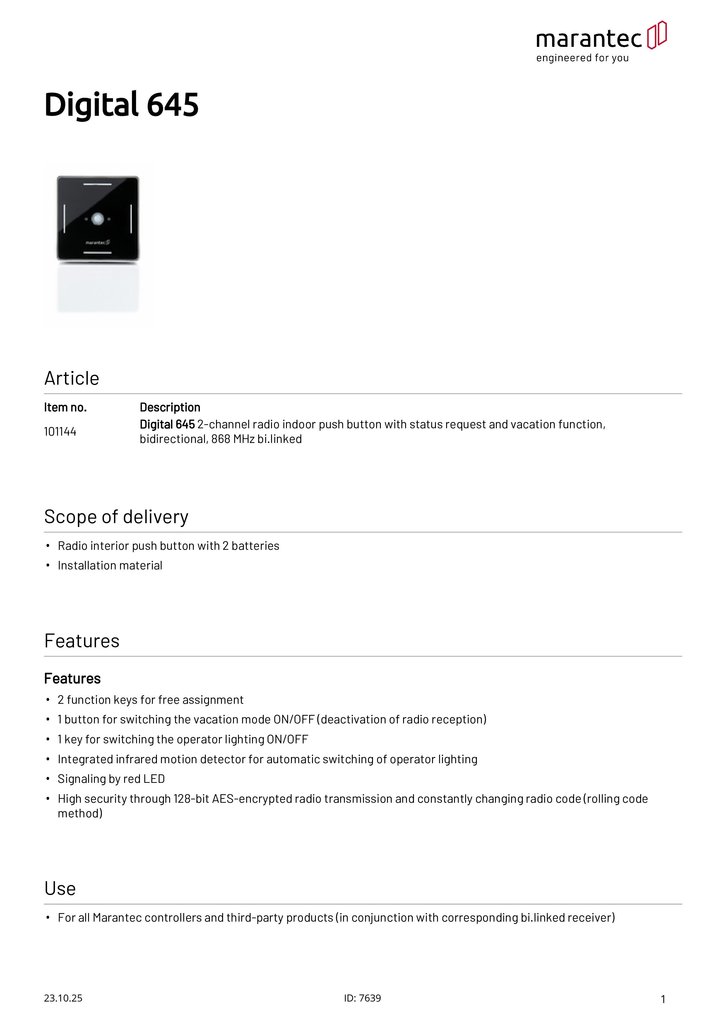 Digital 645 2-Kanal Funk-Innendrucktaster mit Zusatzfunktionen 868 MHz bi.linked (lange Lagerung – evtl. schwache Batterien)