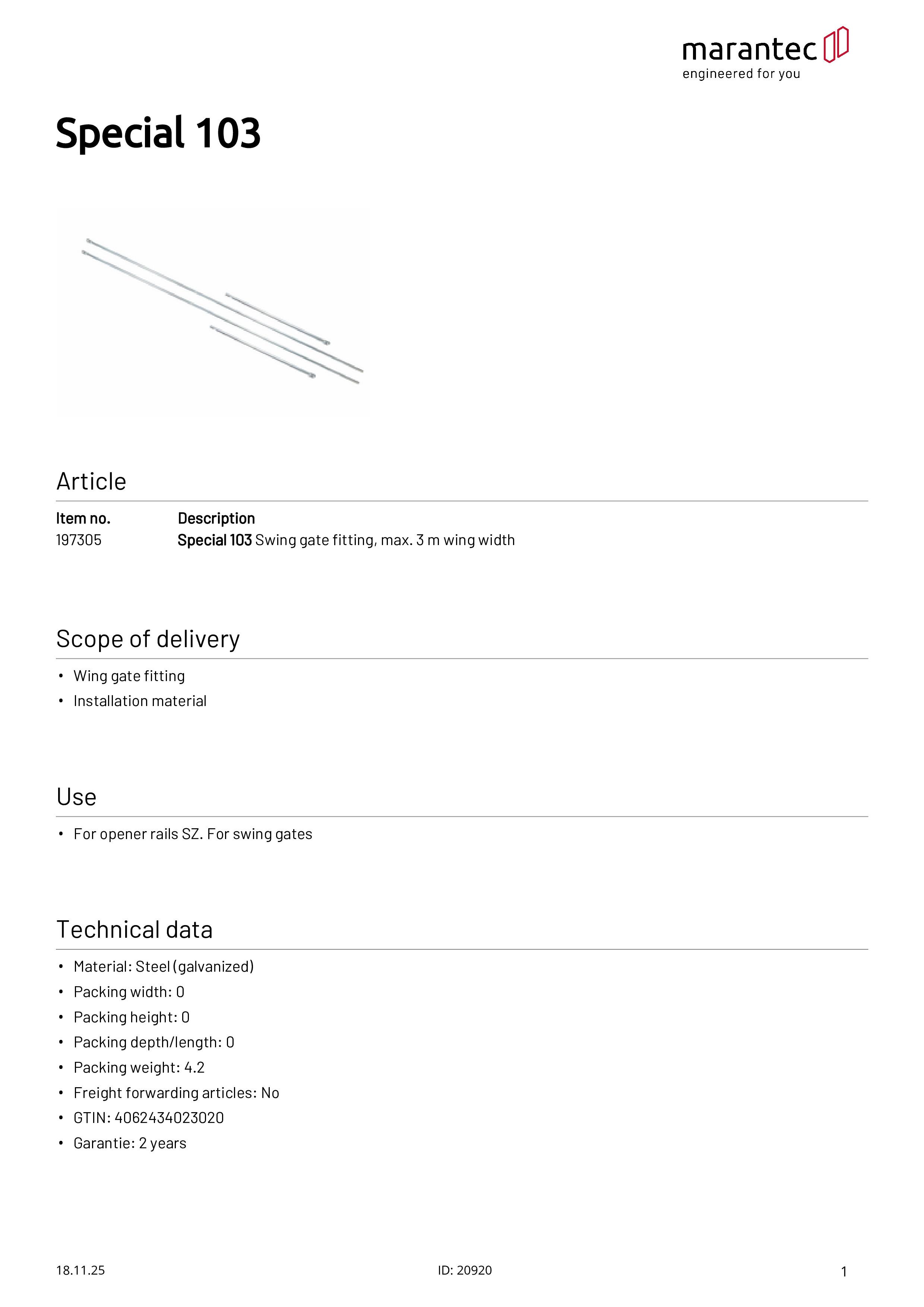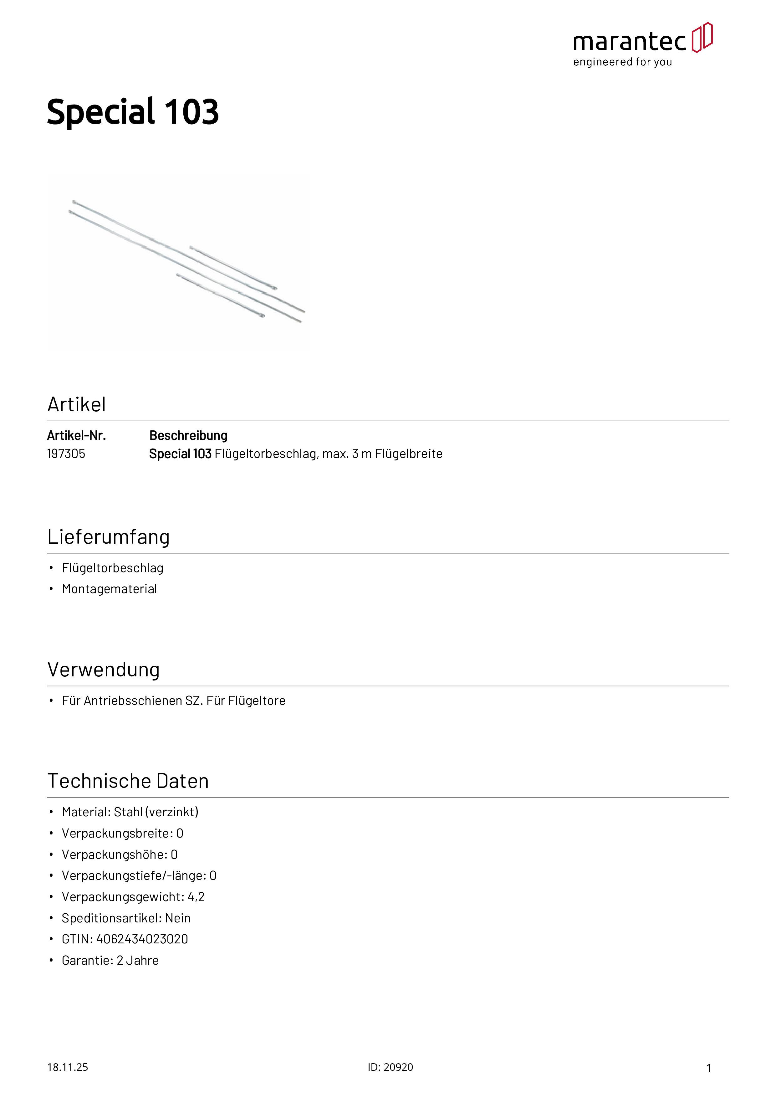 Special 103 Flügeltorbeschlag für nach außen öffnende Torflügel einer Garage
